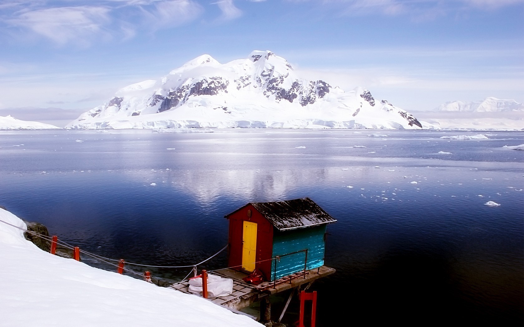 A house on the snowy shore near the mountains