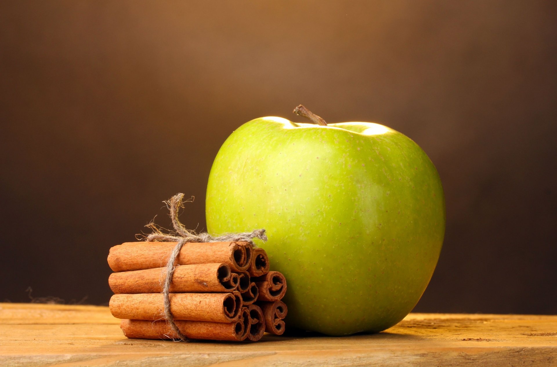 Widescreen shot of an apple with cinnamon sticks