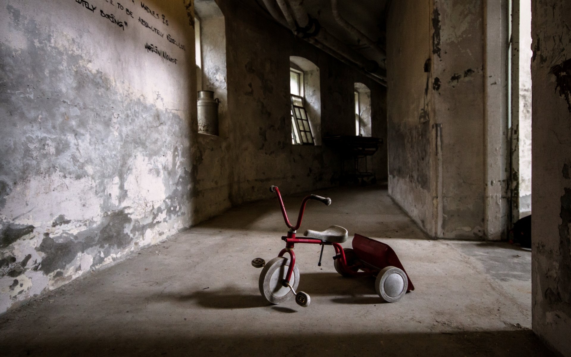 A bicycle in a room with old walls