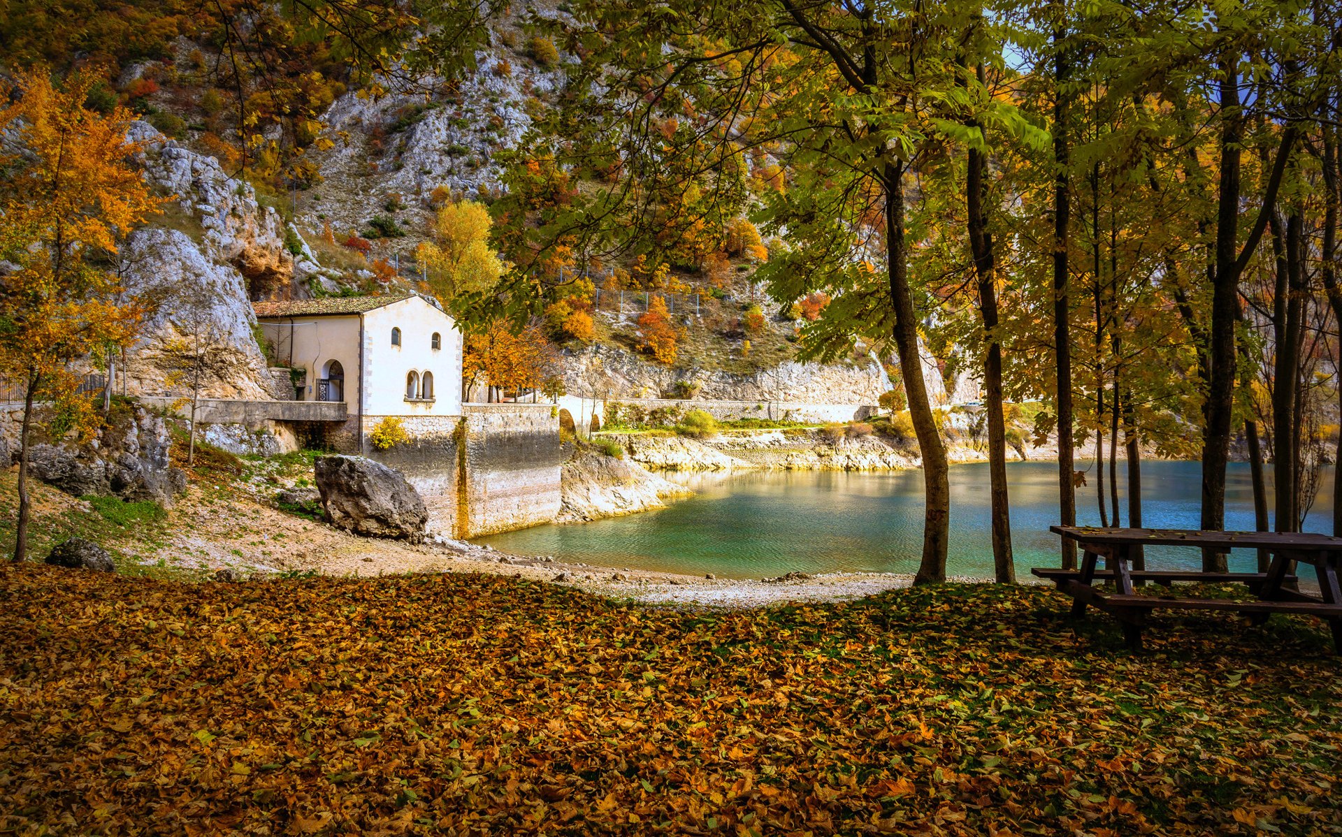 The coast of Lake Baikal. Wooden houses, trees, valley