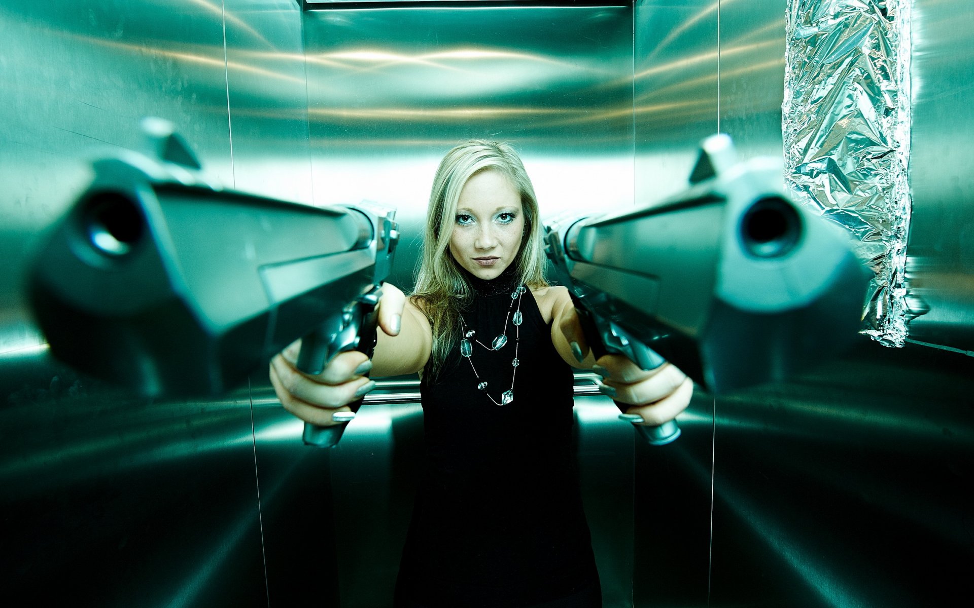 Four women and three men stand in a row and hold weapons in their handsFour women and three men stand in a row and hold weapons in their hands