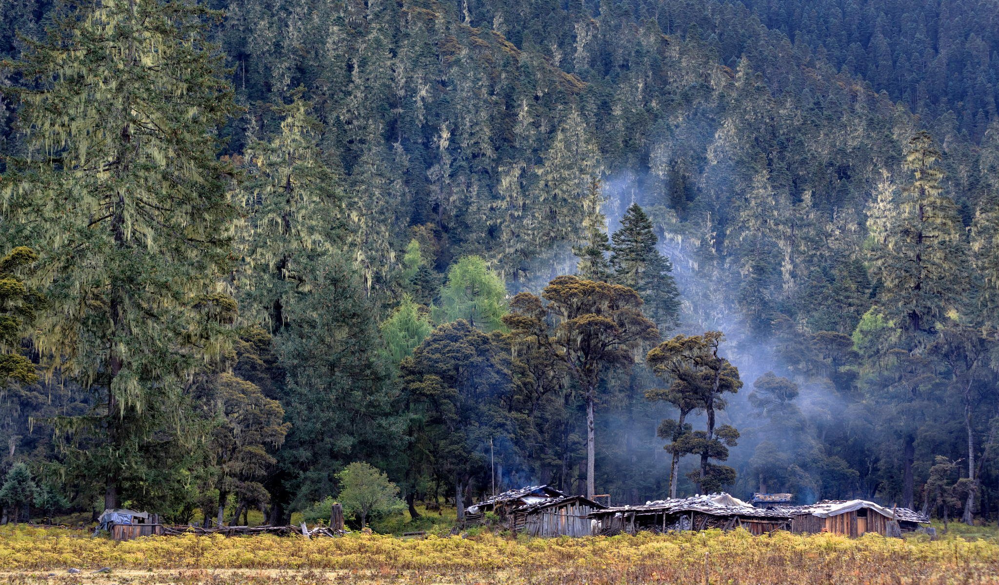 The road leading into the forest past fields and treesThe road leading into the forest past fields and trees