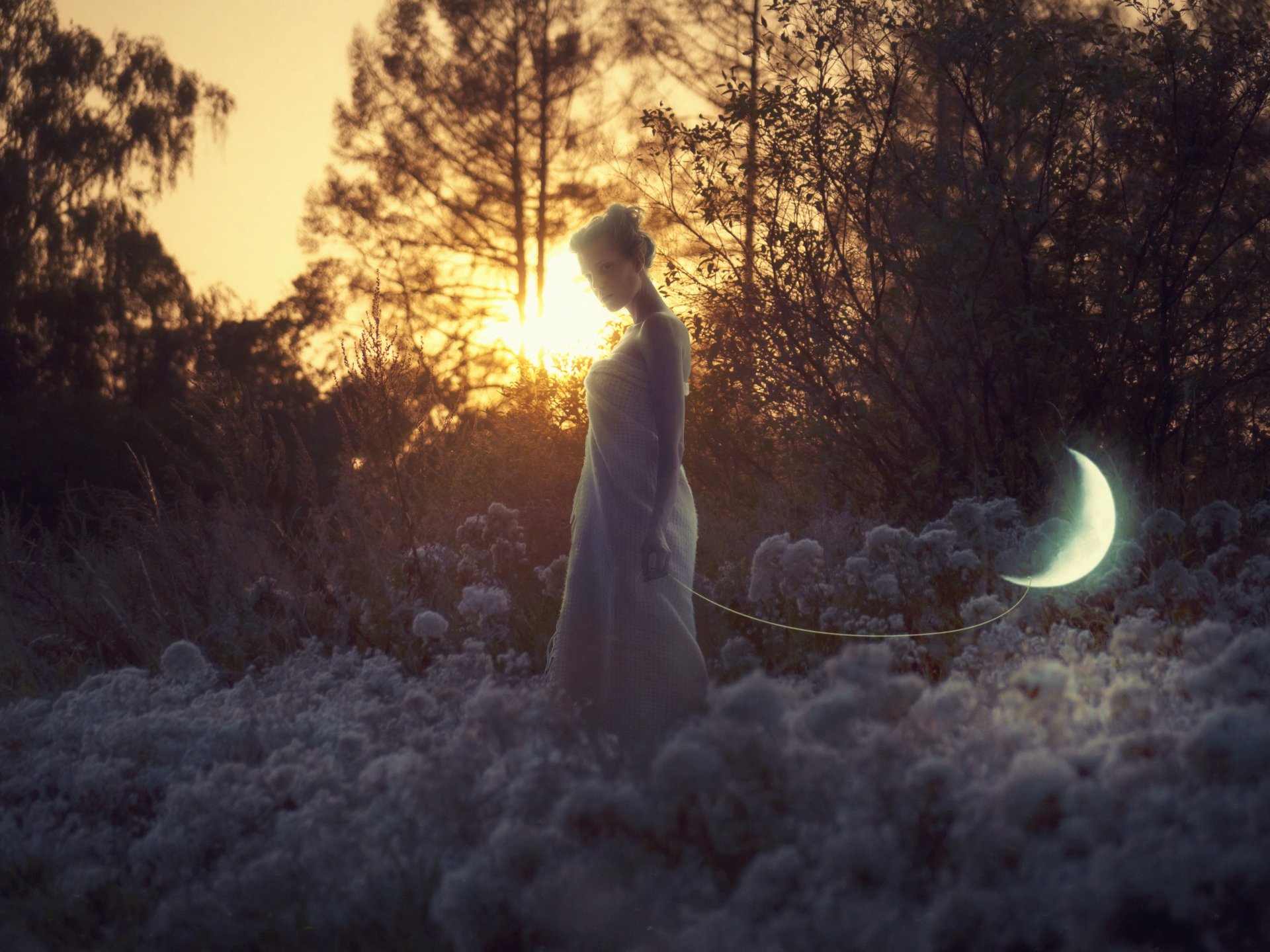 The moon on a string following the girl