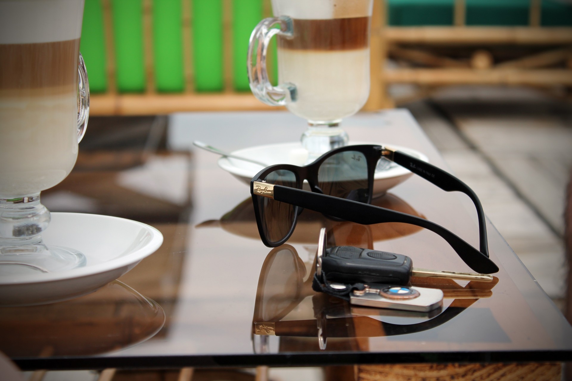 A table on which there are mugs, glasses and keys with a bmw keychain are lyingA table on which there are mugs, glasses and keys with a bmw keychain are lying