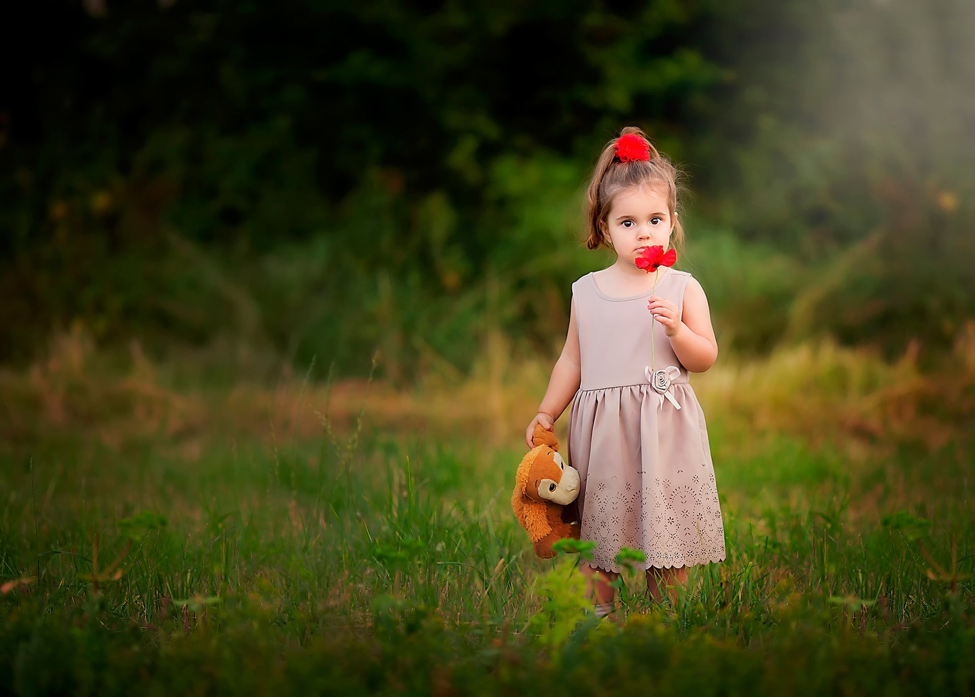 A toy in the form of a girl is standing in the snow, and behind the white lights