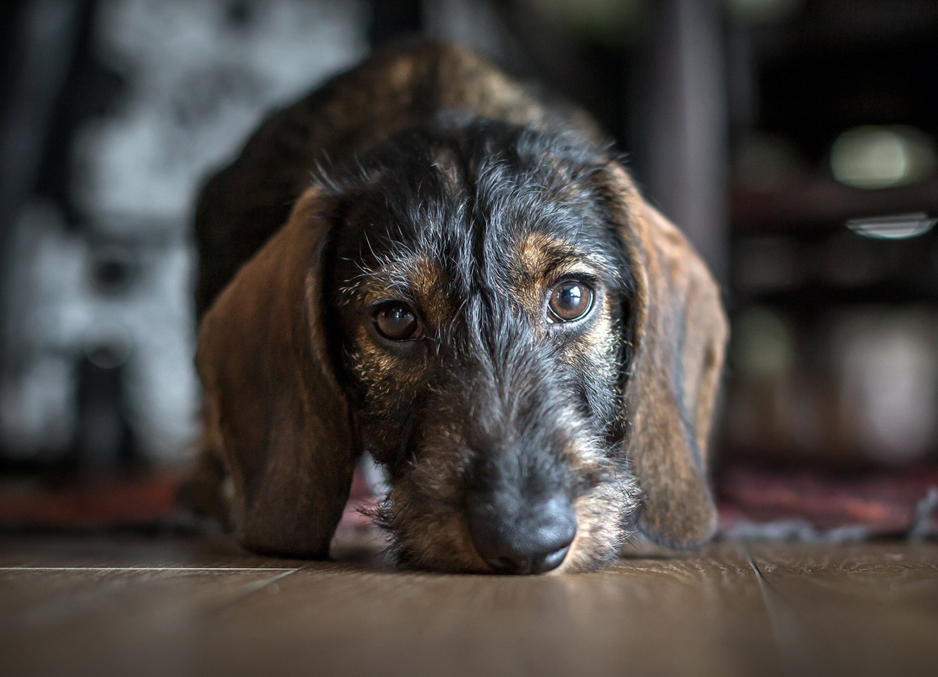 The puppy is lying on the floor in the house and looks sad