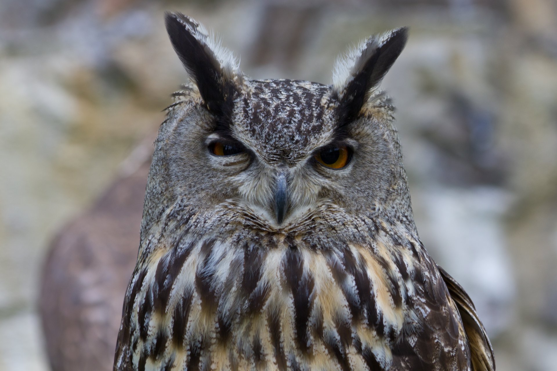 Owl squints into the camera lens