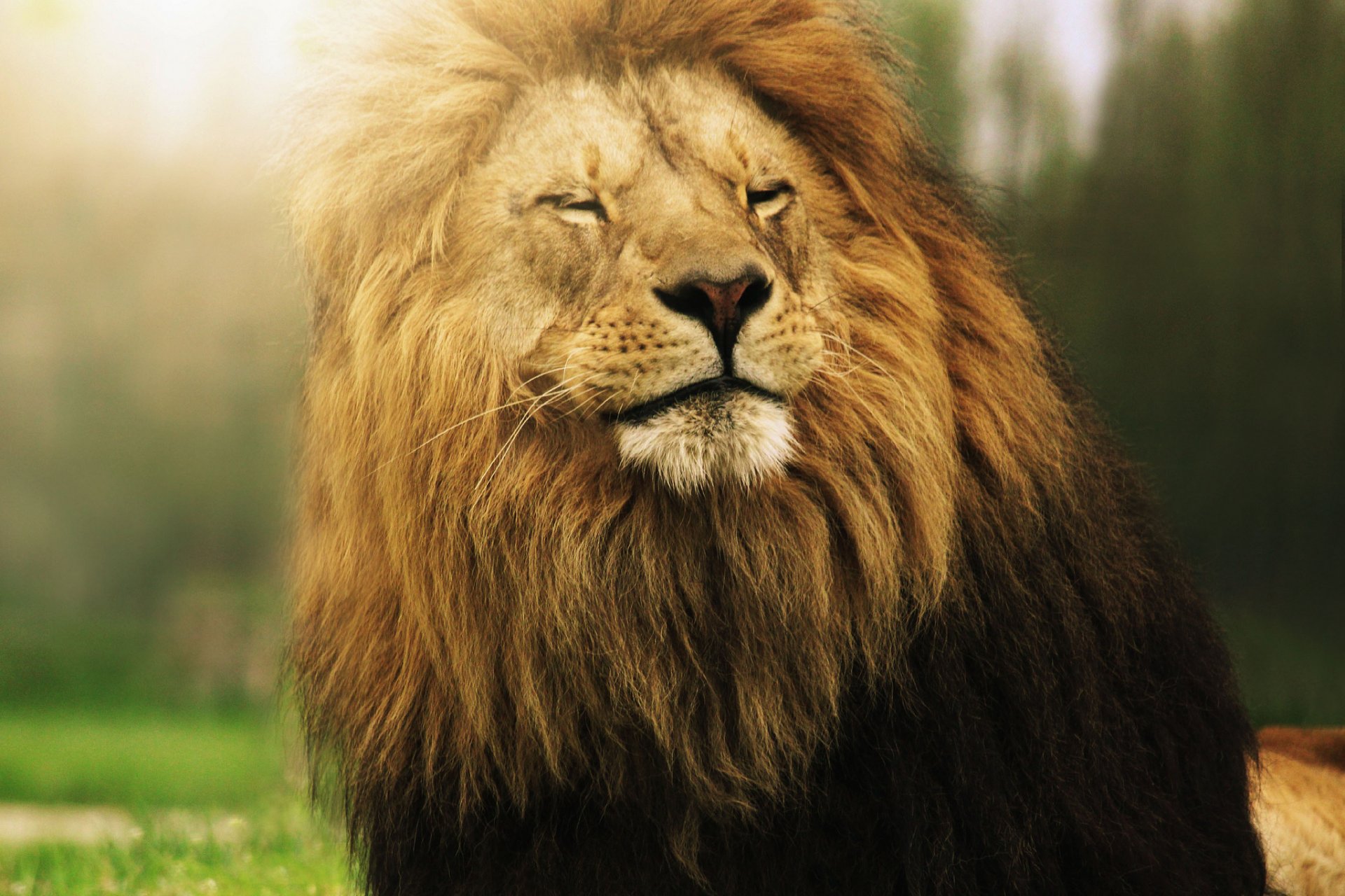A big lion squints on a sunny day