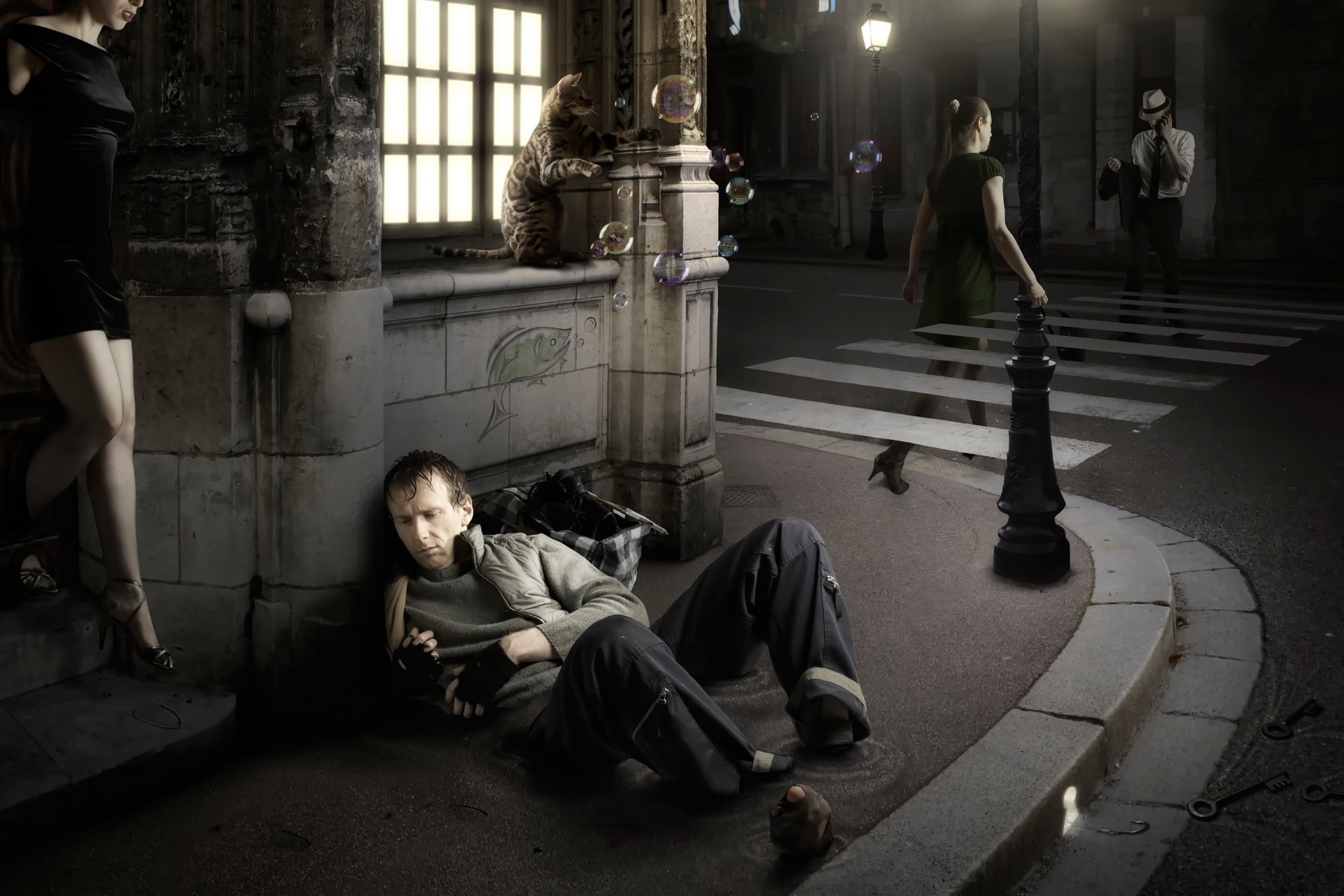A tramp sleeps on the street of a transparent cityA tramp sleeps on the street of a transparent city