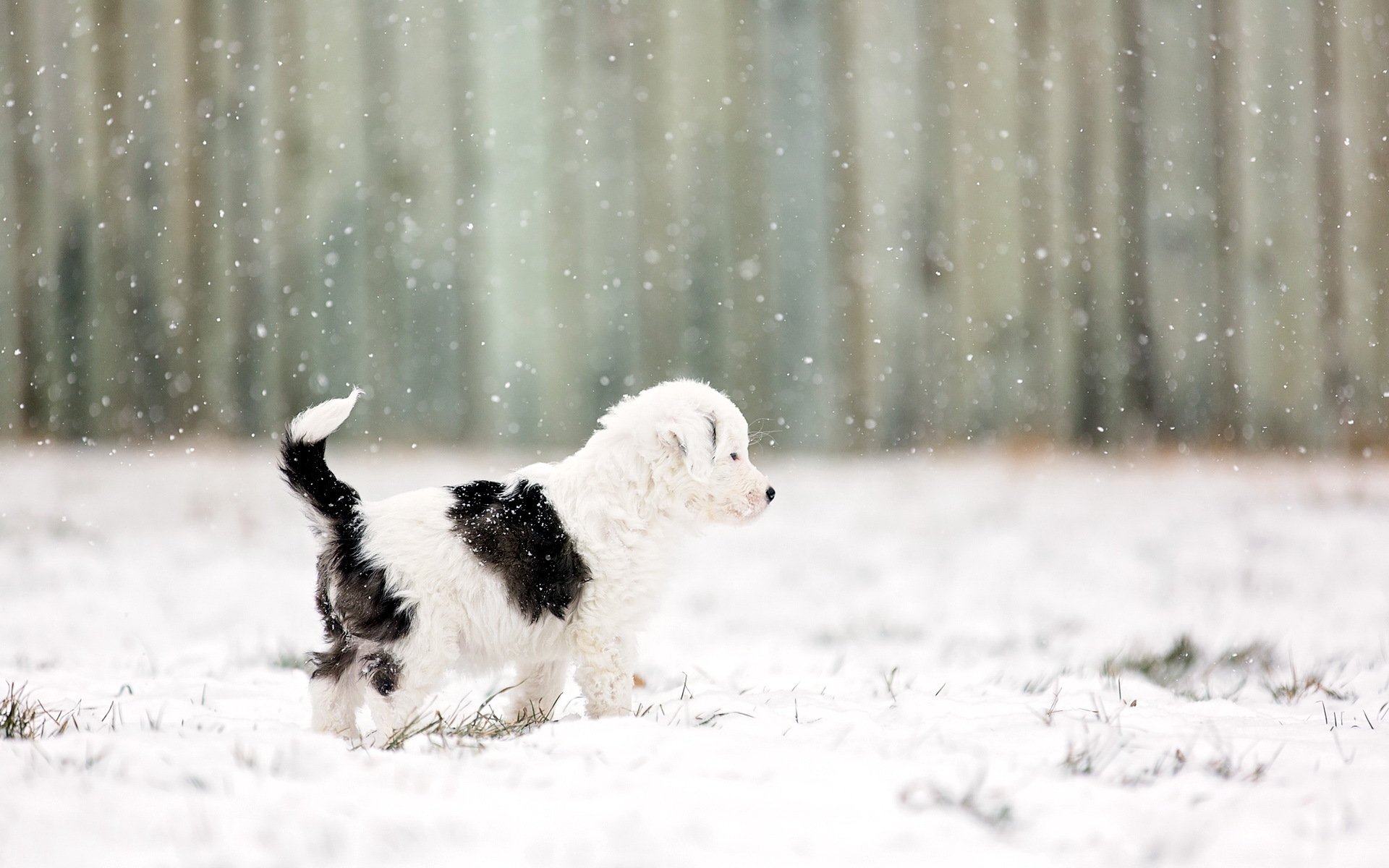 Little black and white puppy sideways