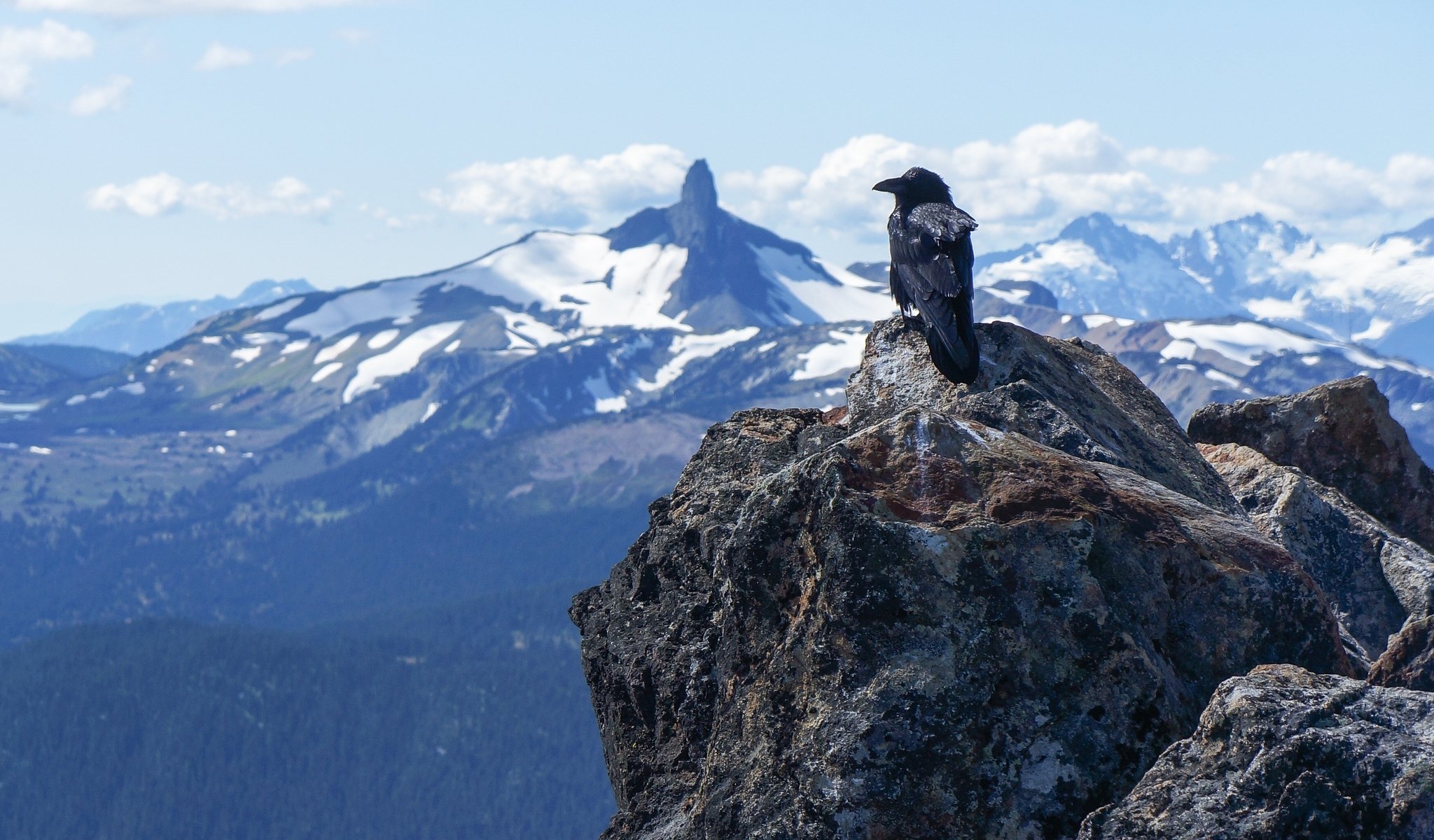 The raven looks down from the mountains