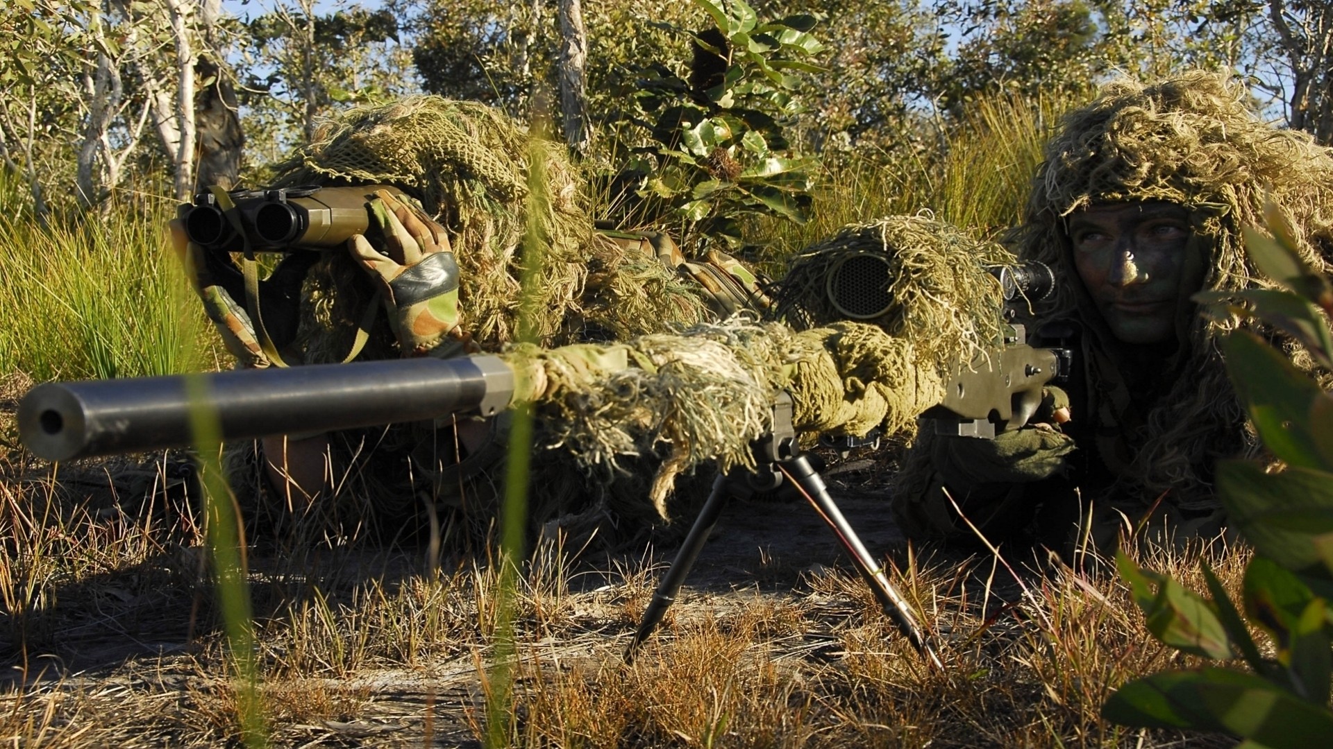 Masked soldiers with a gun are looking out for a targetMasked soldiers with a gun are looking out for a target