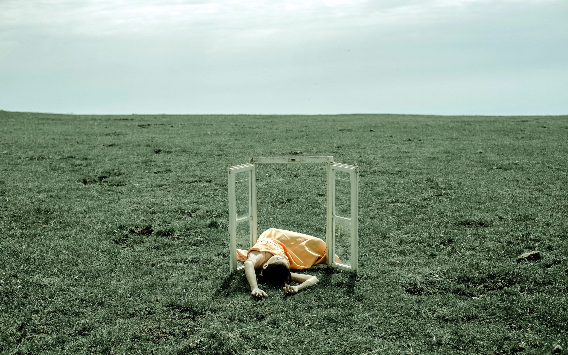 Art house photo, open shutters of a window in a field with a girl in itArt house photo, open shutters of a window in a field with a girl in it