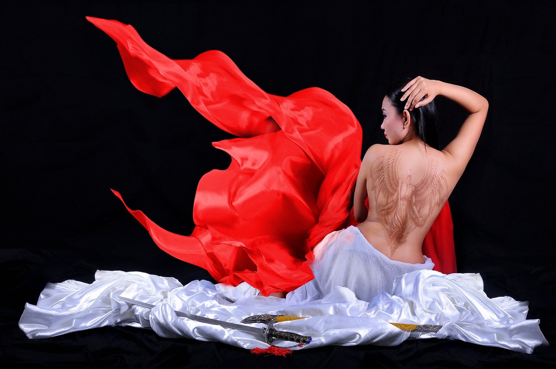 Asian woman with a tattoo of wings on a black background