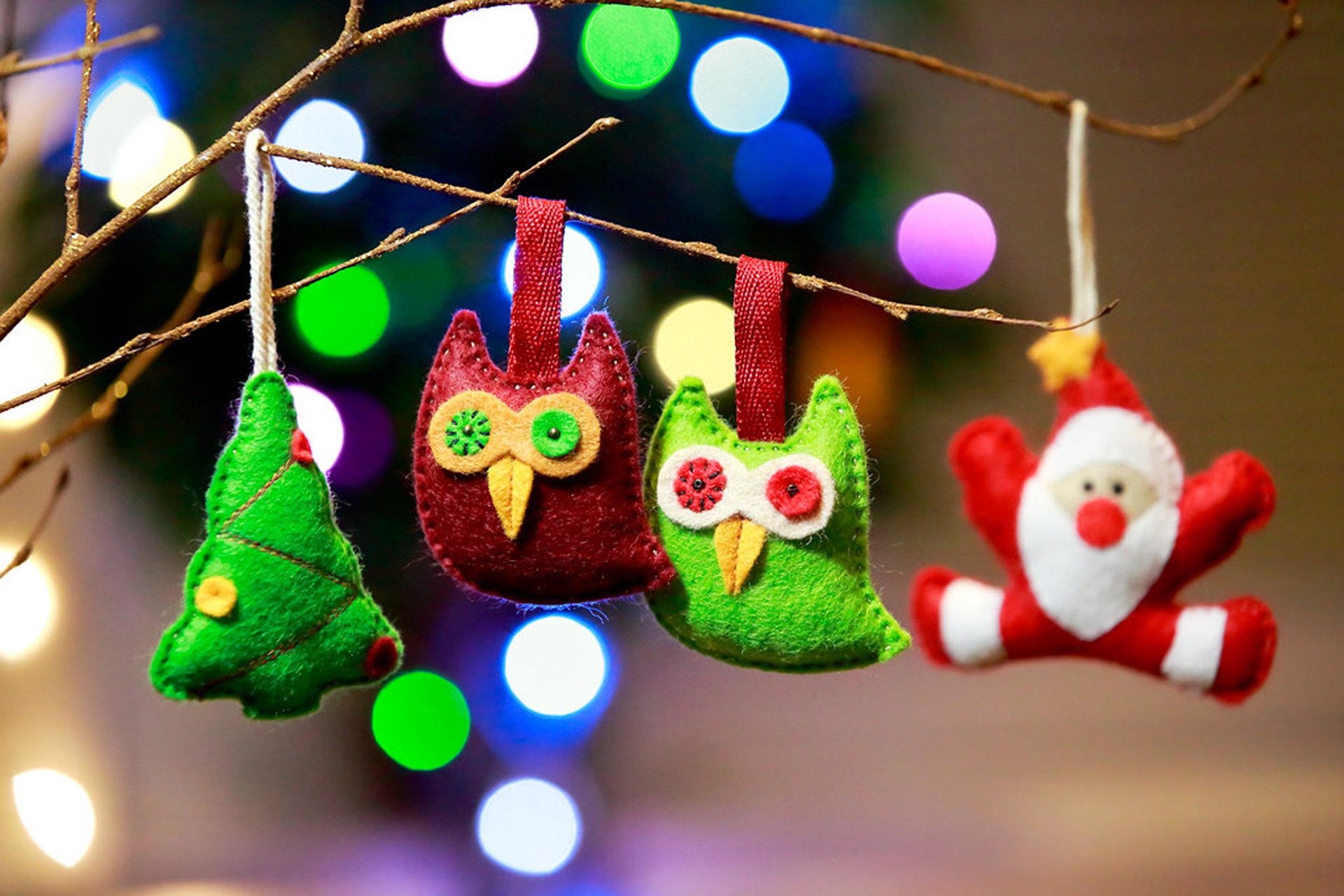 Green and red owls with a christmas tree and santa claus on a branchGreen and red owls with a Christmas tree and Santa Claus on a branch