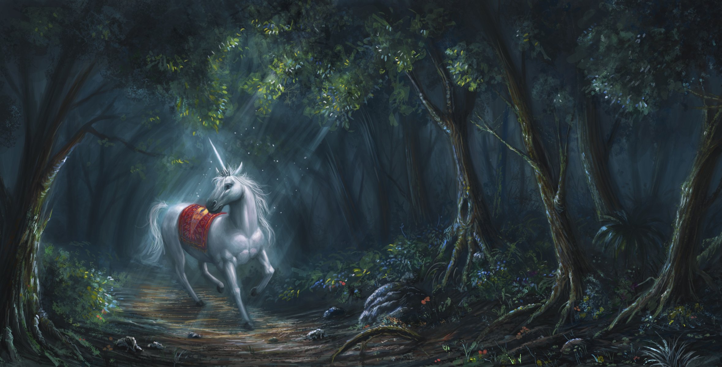 Forest white unicorn reflecting moonlight