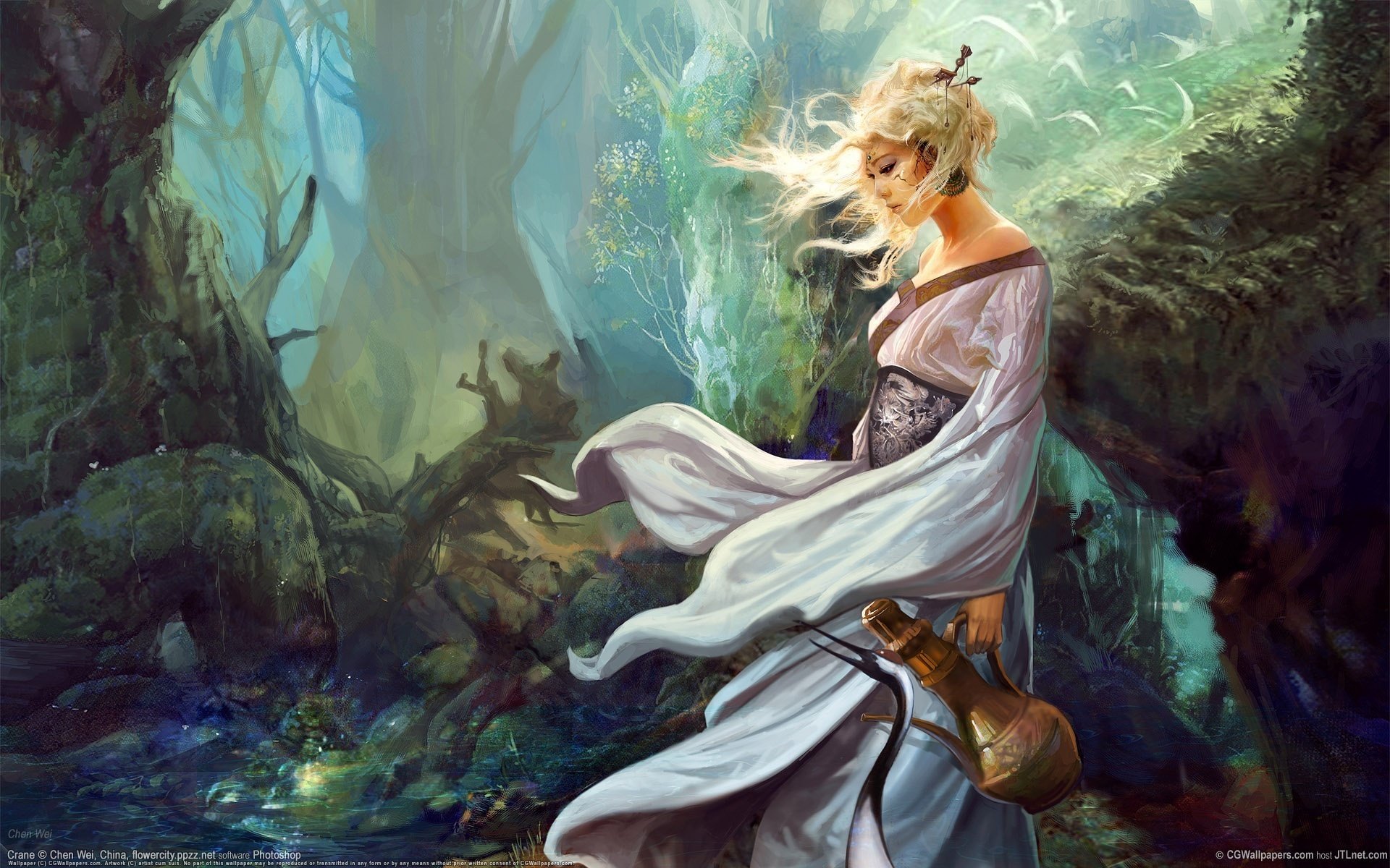 Mysterious girl with a jug in a dress