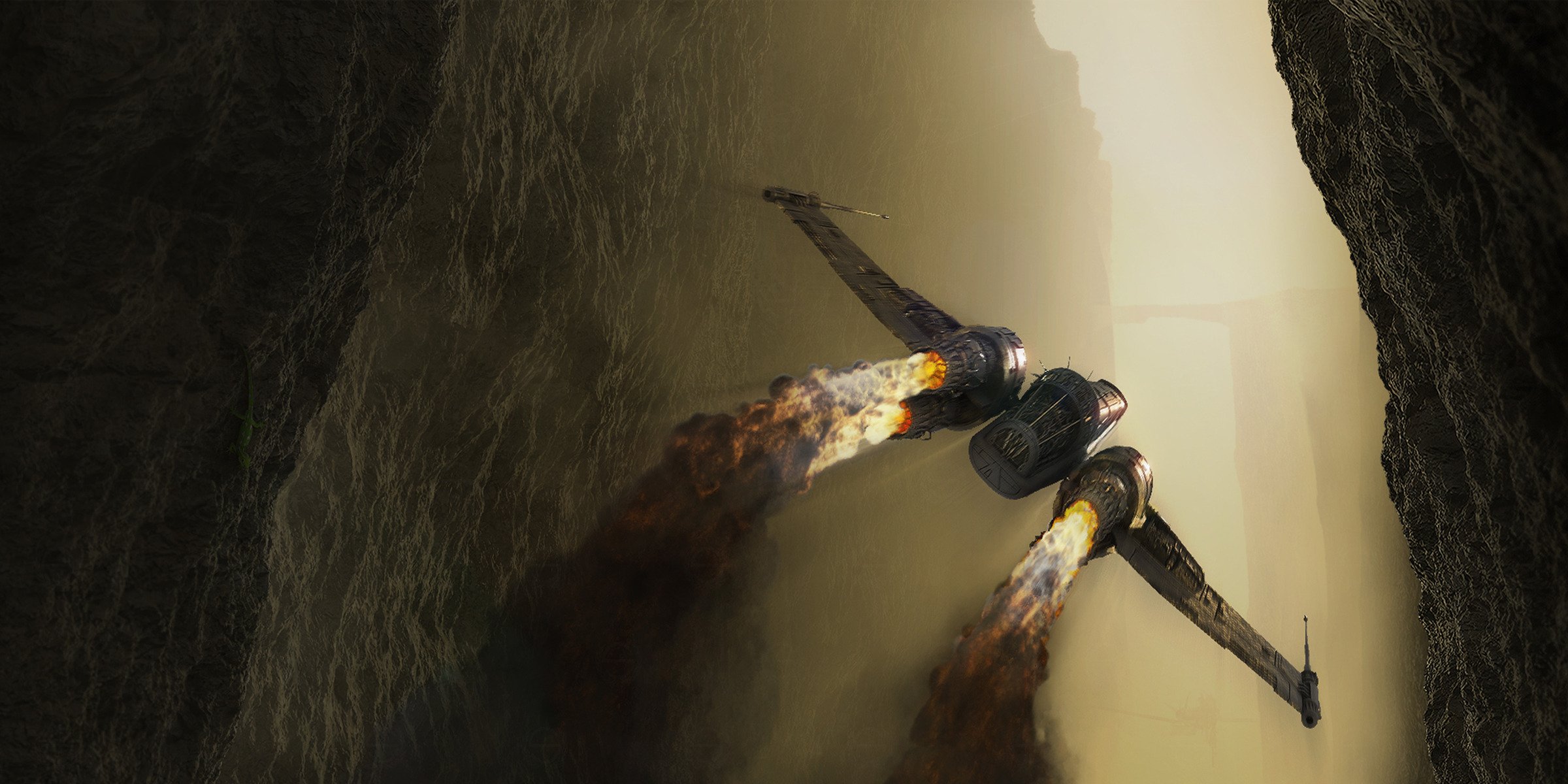 A gorge with green grass on one side and a crashed plane on the otherA gorge with green grass on one side and a crashed plane on the other