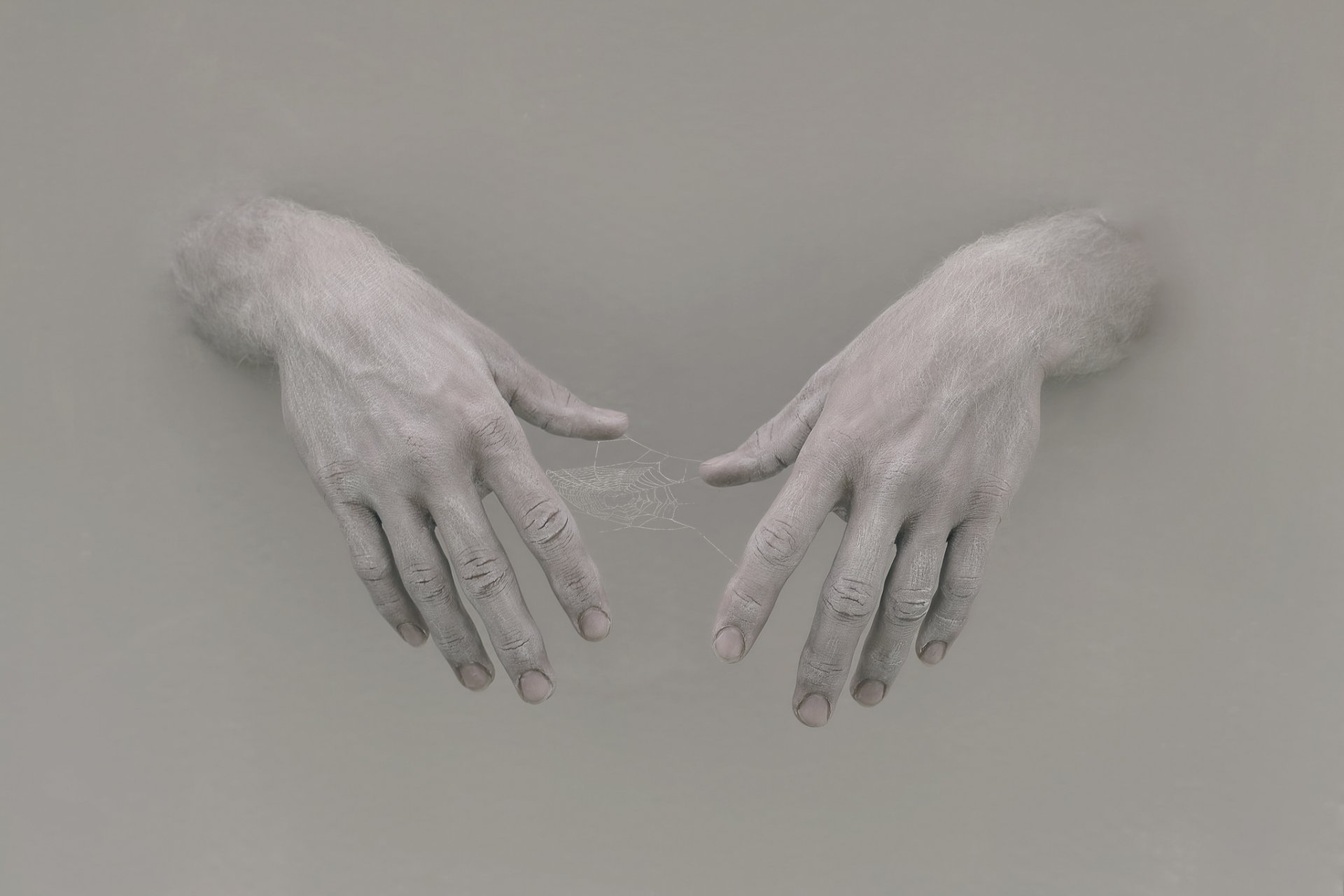 The web between the hands on a gray background