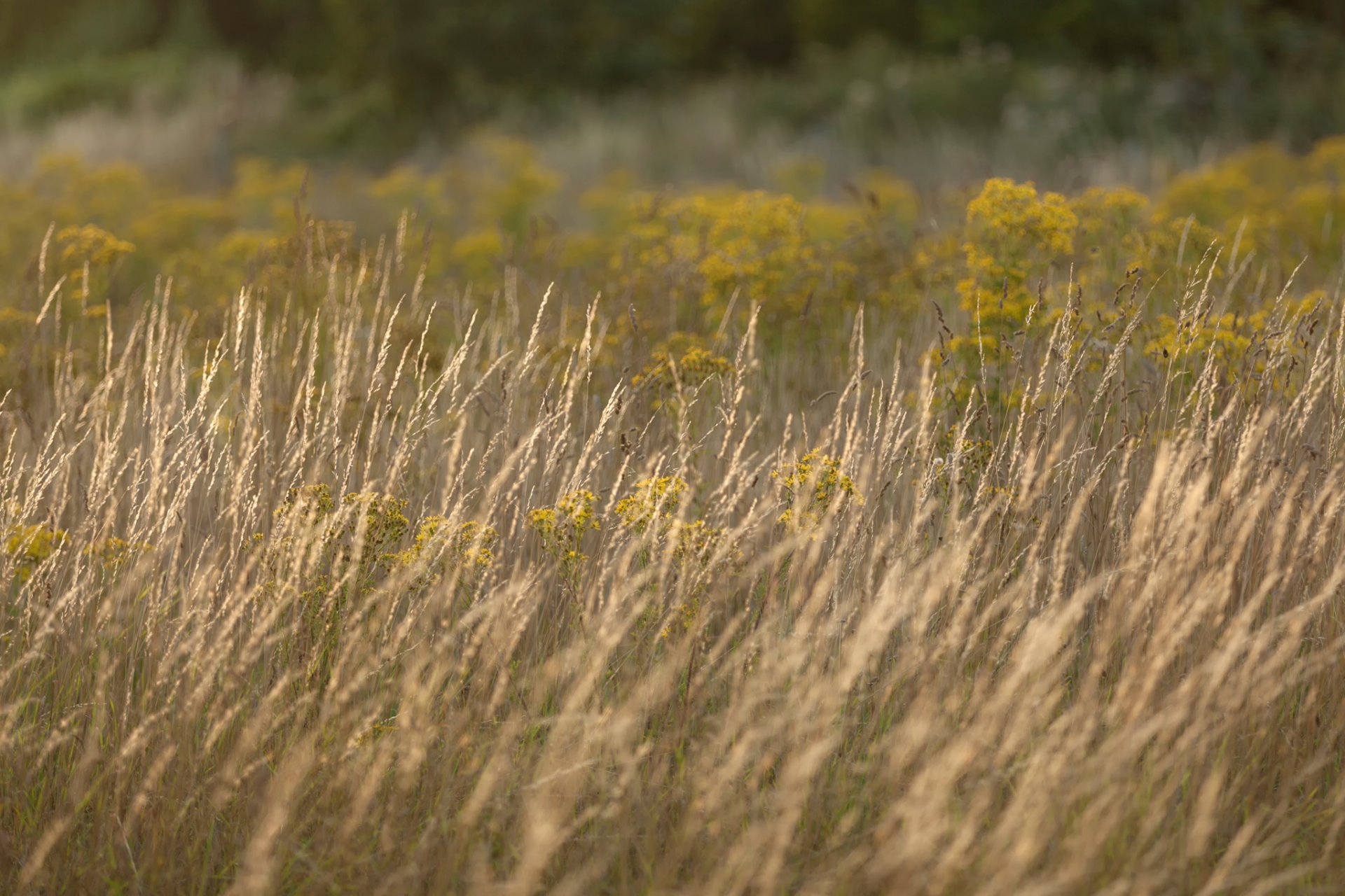 A black and white lighthouse behind a wall of grassA black and white lighthouse behind a wall of grass