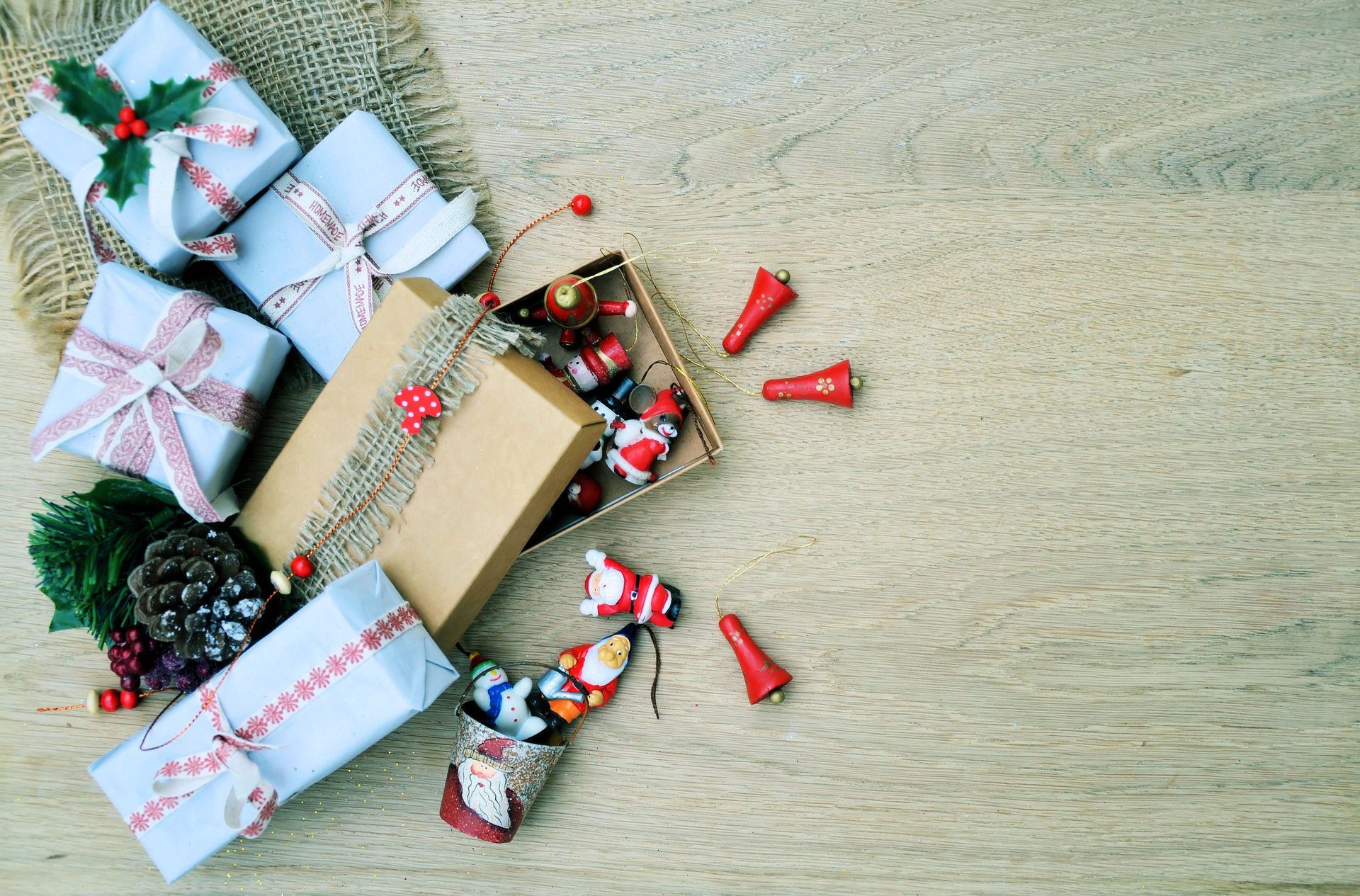 Gift boxes, one of which is with Christmas figurines
