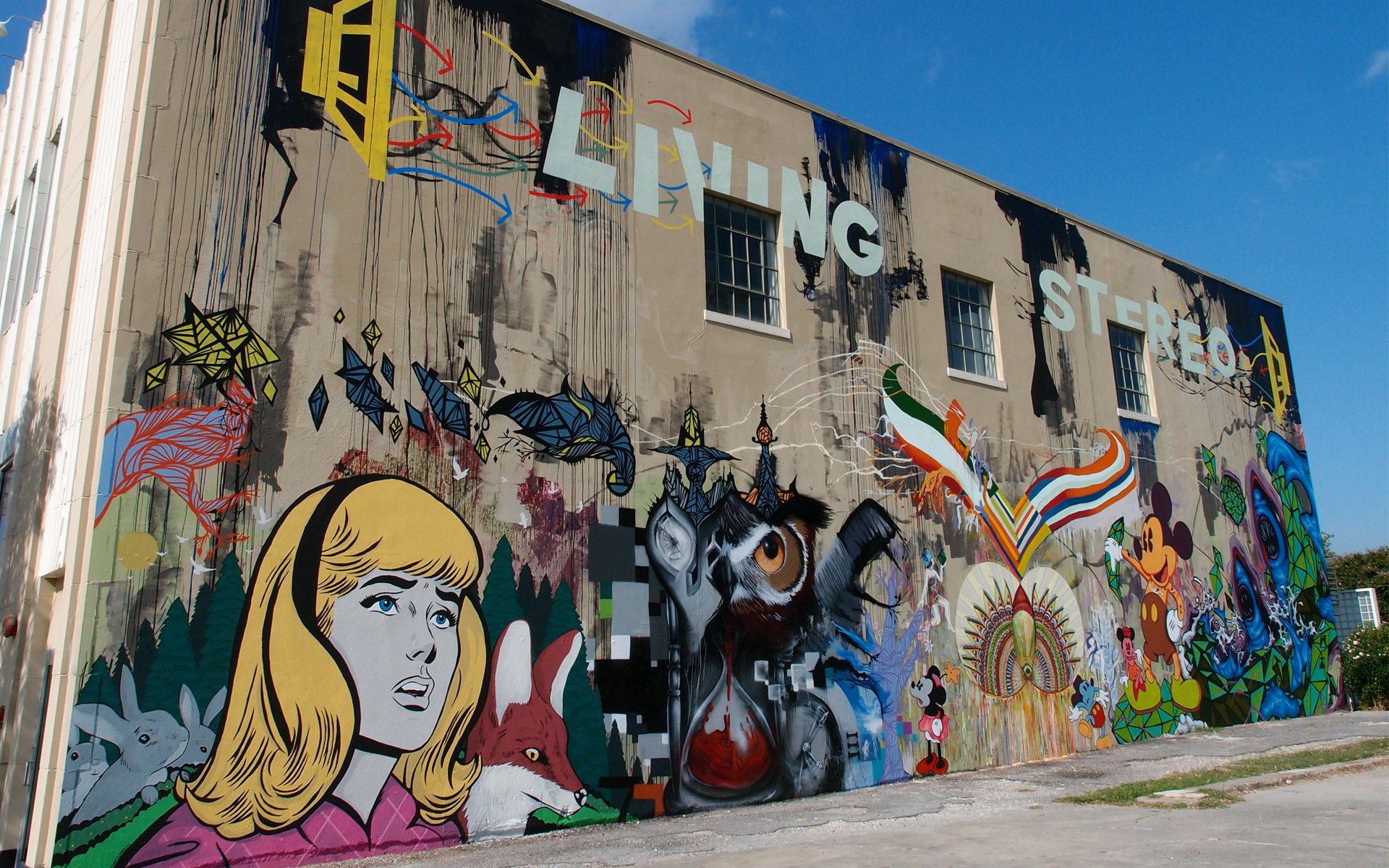 A building with multicolored graffiti depicted on itA building with multicolored graffiti depicted on it