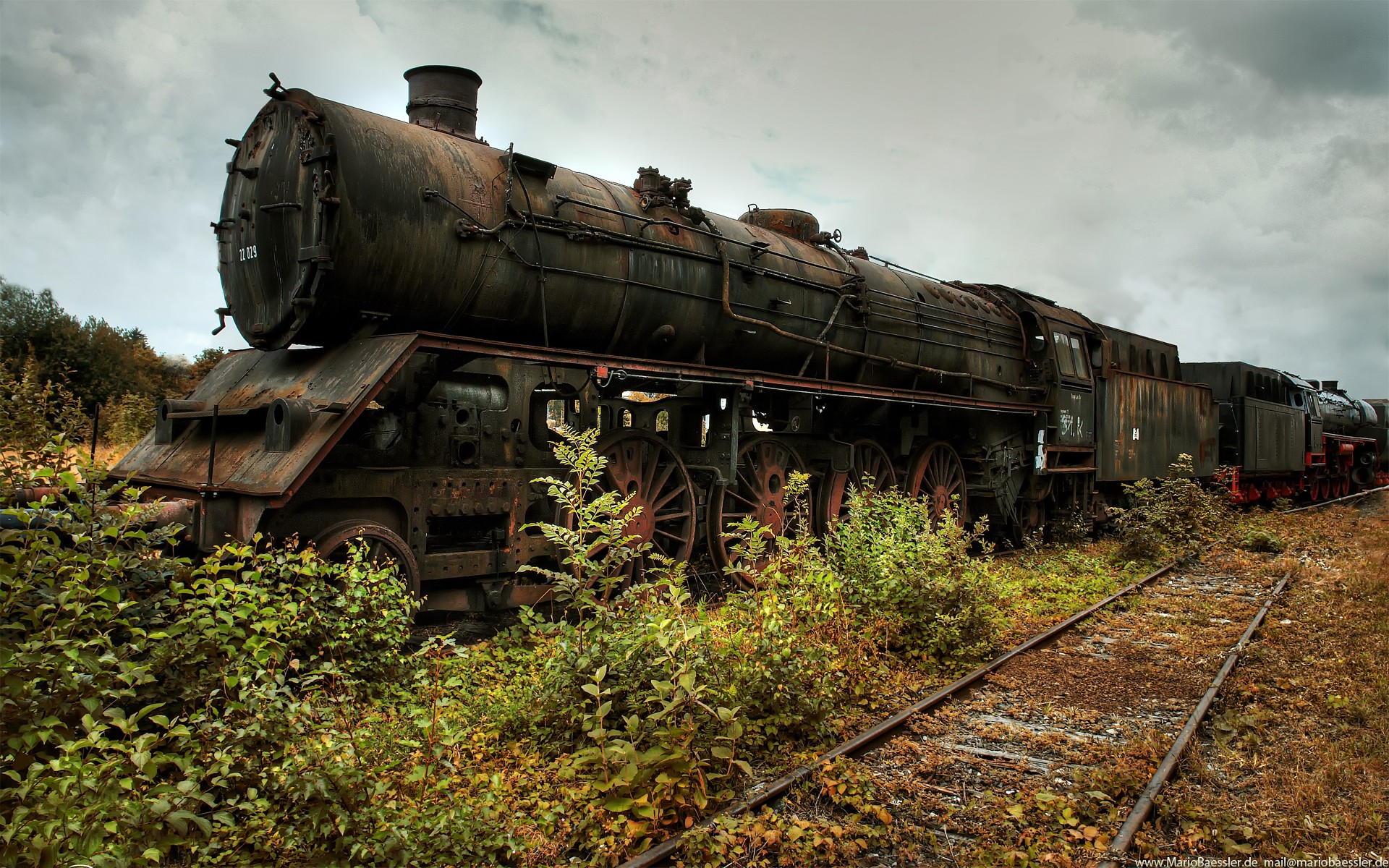Old, rusty train on the background of rails and bushes