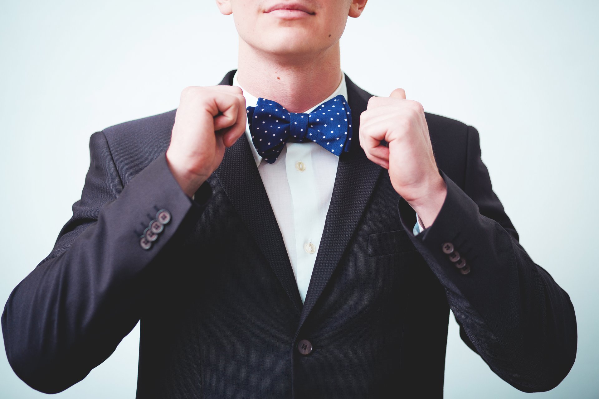 The groom puts on a blue bow tie with a black suitThe groom puts on a blue bow tie with a black suit