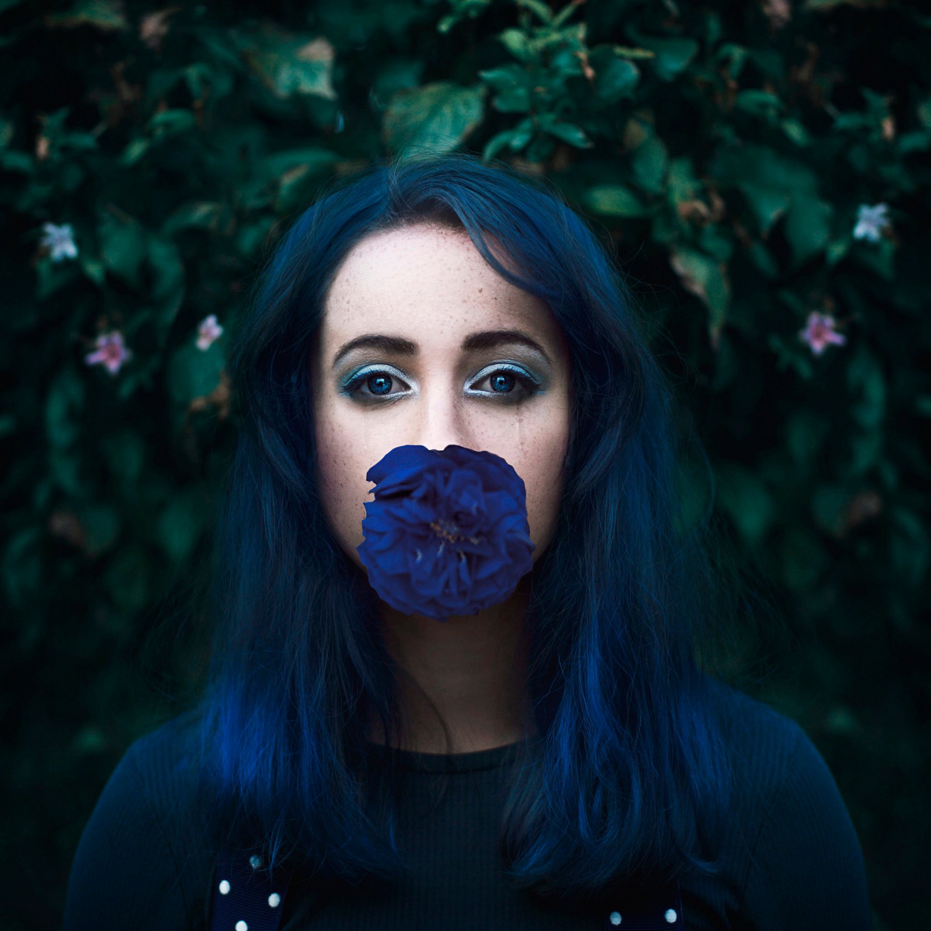 A girl in blue shades holds a blue flower with her lipsA girl in blue shades holds a blue flower with her lips