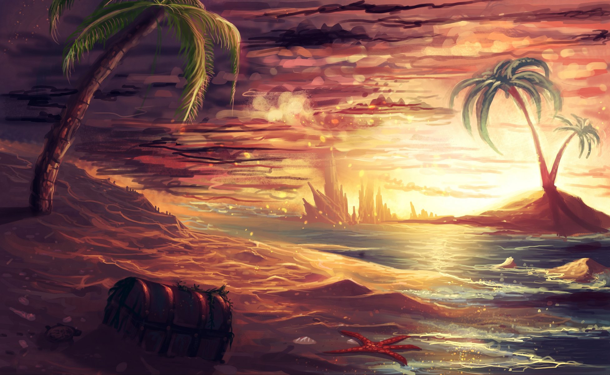 A picture of a sunset on the sea with a chest and a palm treeA picture of a sunset on the sea with a chest and a palm tree