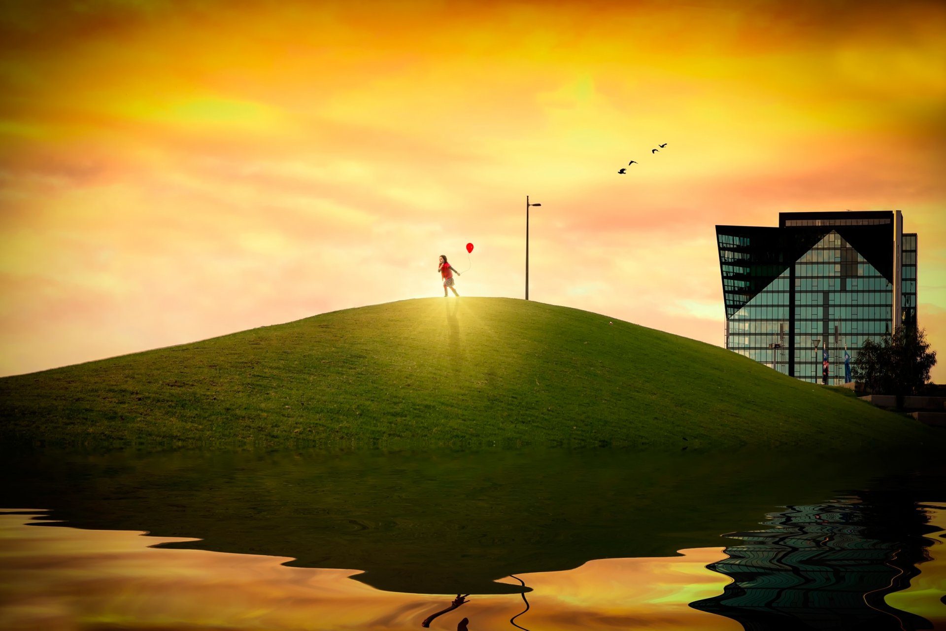 Fabulous red fireflies and butterflies play with a childFabulous red fireflies and butterflies play with a child