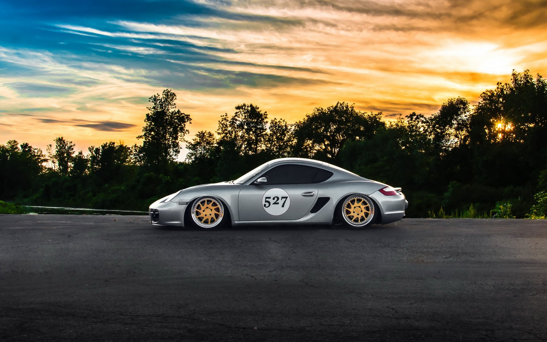 Silver porshe cayman at sunset
