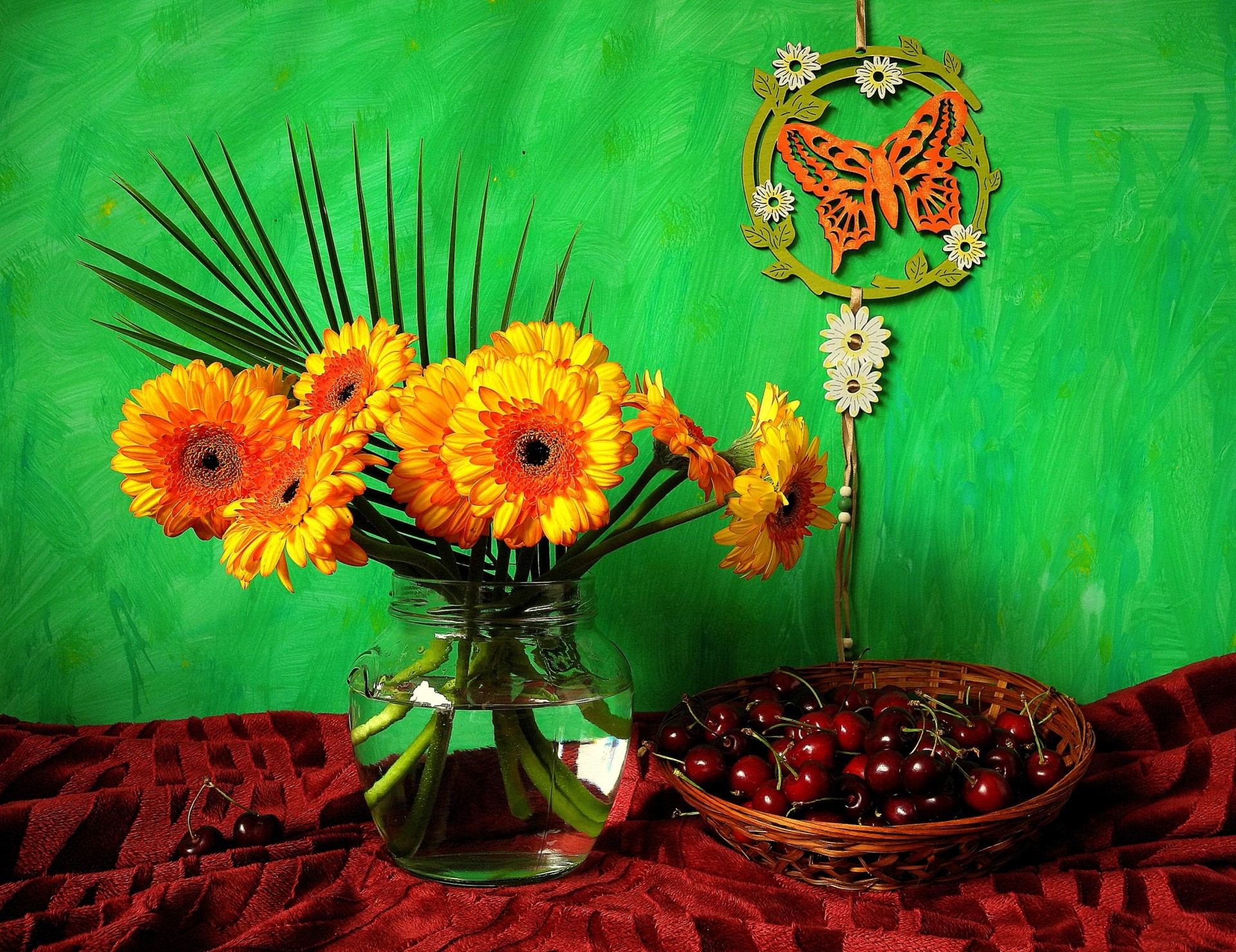 Production of chrysanthemums and cherries on a green backgroundProduction of chrysanthemums and cherries on a green background