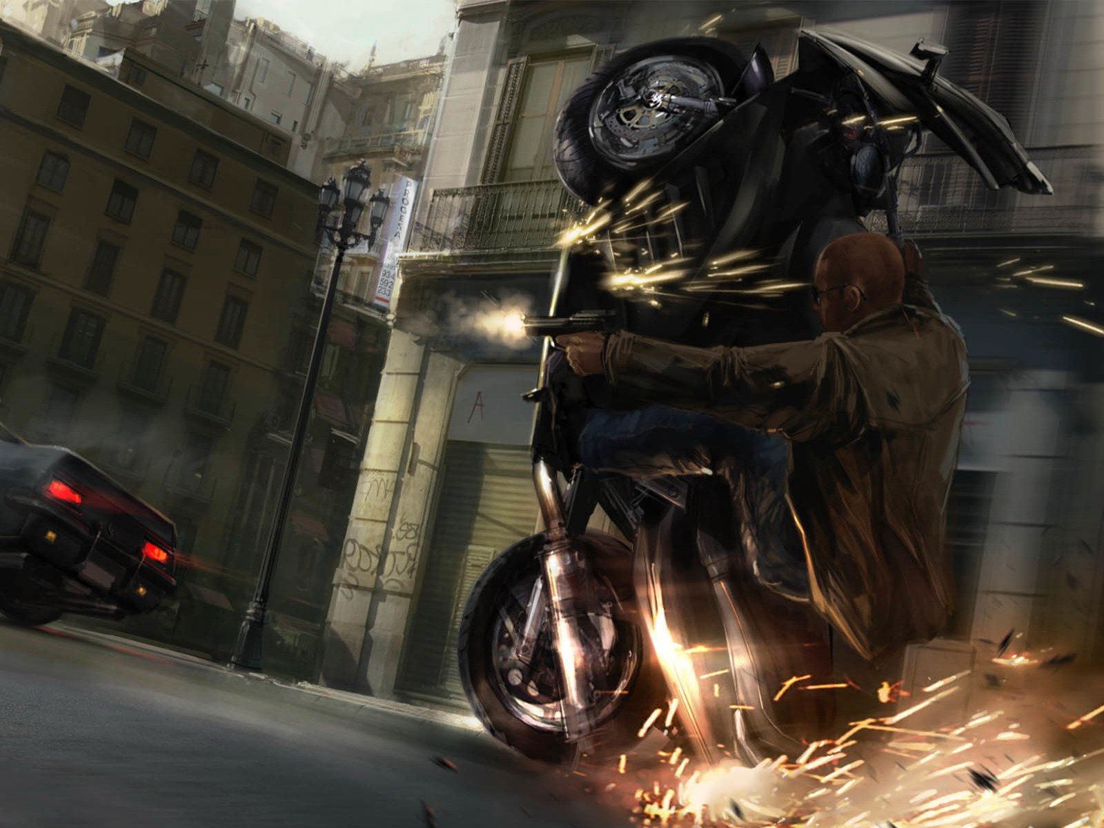 Sparks from a motorcycle in a shooting chase