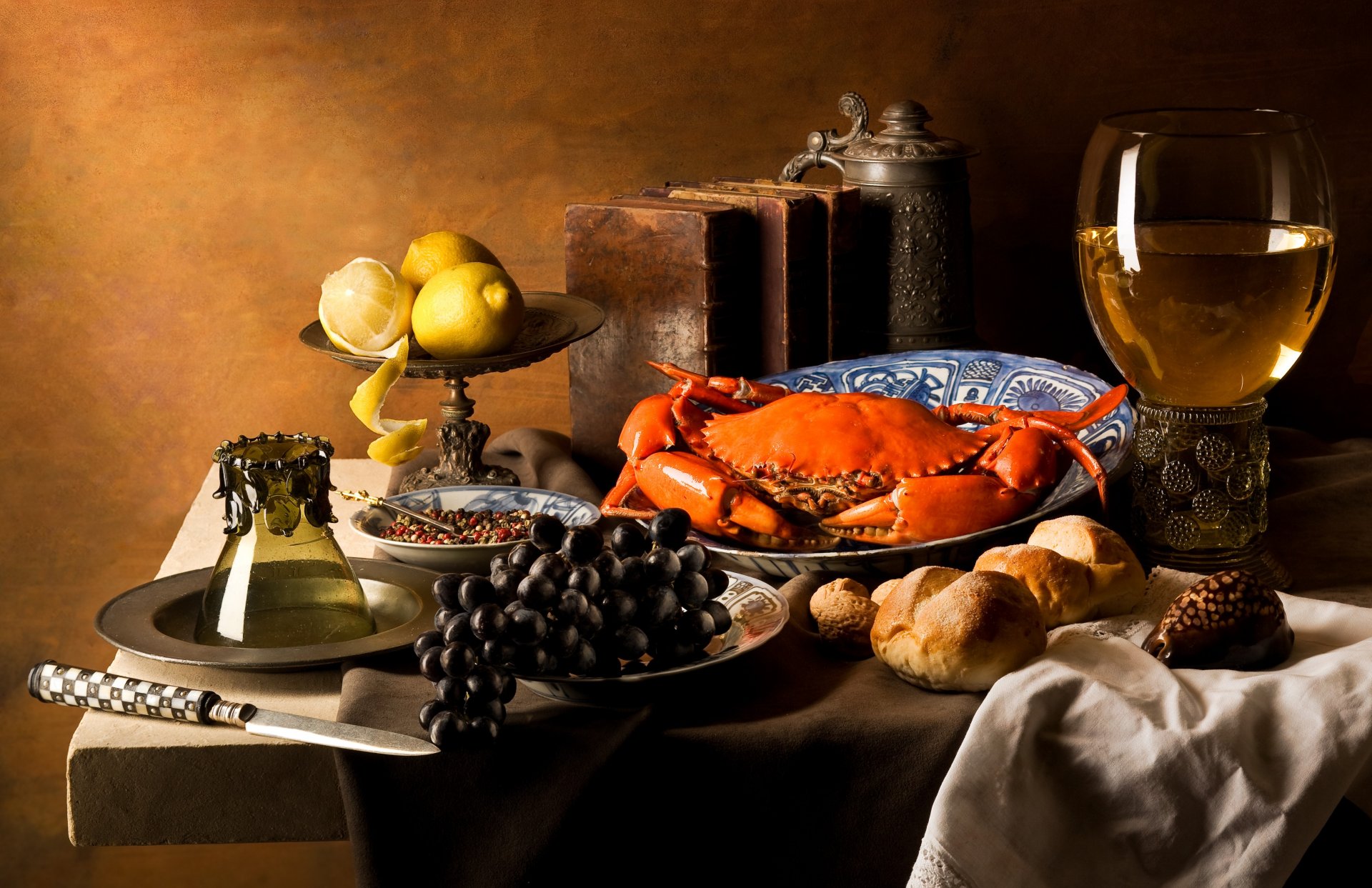 Crab in a dish on the table with grapes, lemons and a drinkCrab in a dish on the table with grapes, lemons and a drink