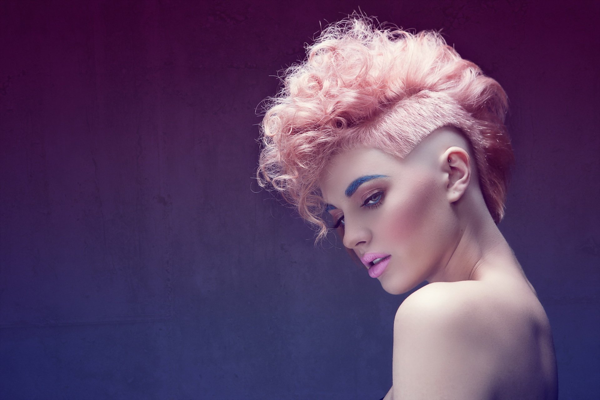A girl on a purple background with beautiful makeup