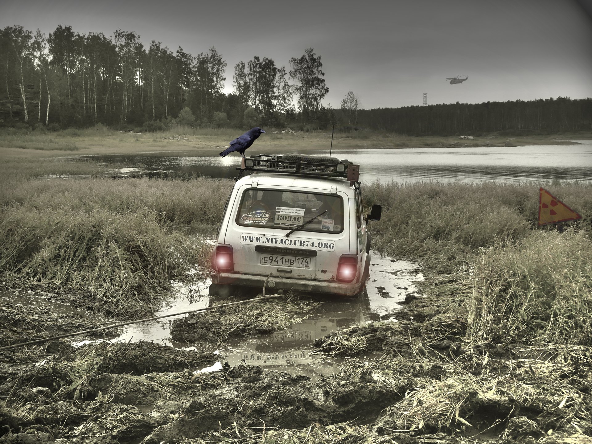 Chernobyl stalker, a field stuck in the mud with a raven on the roof. around the forest and radiationChernobyl stalker, a field stuck in the mud with a raven on the roof. Around the forest and radiation