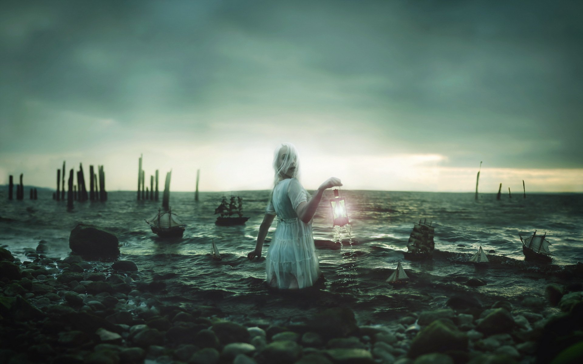A blonde in a white dress lights the way of small ships with a lanternA blonde in a white dress lights the way of small ships with a lantern