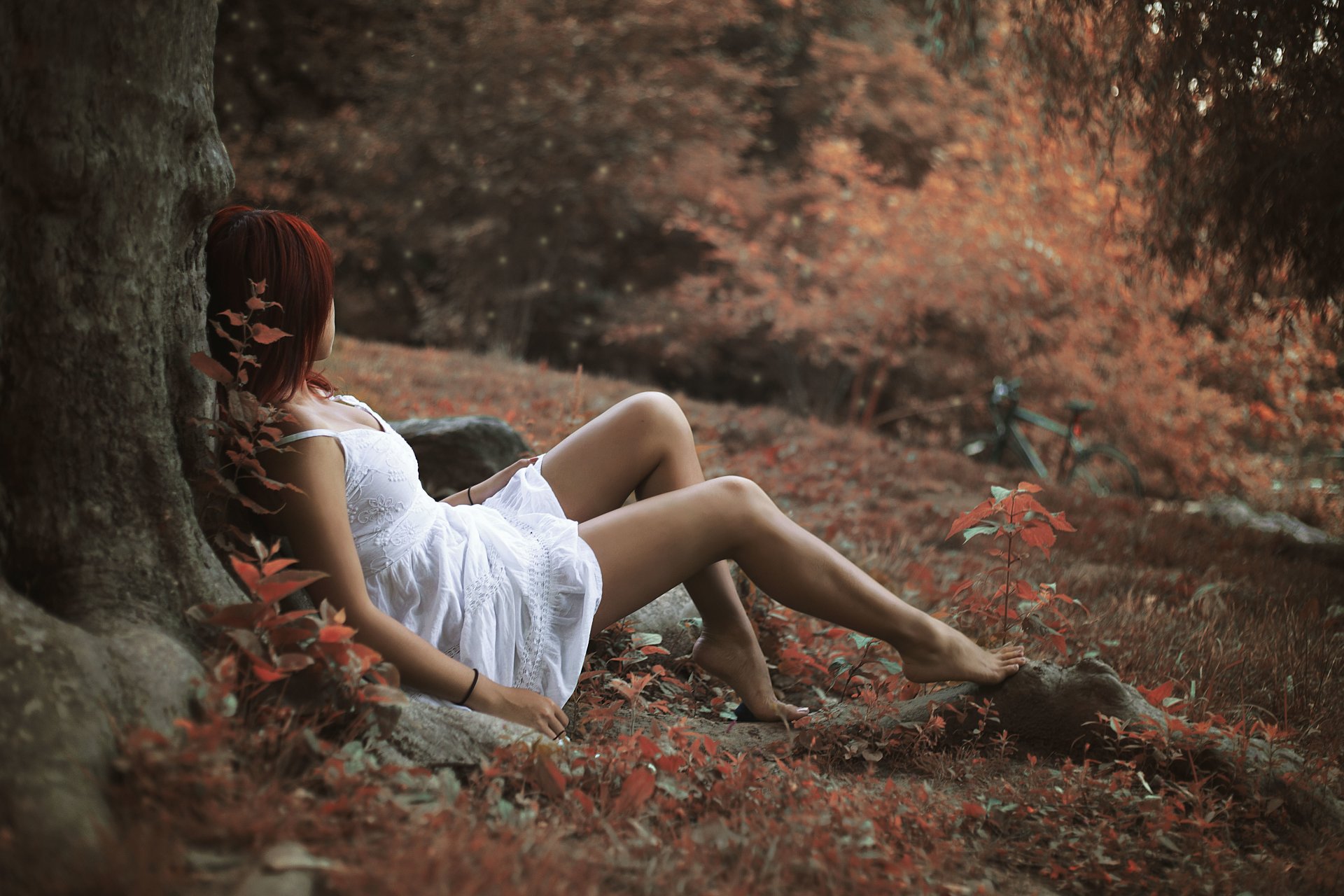 A girl in an interesting pose looks directly into the camera in a black-and-white photo