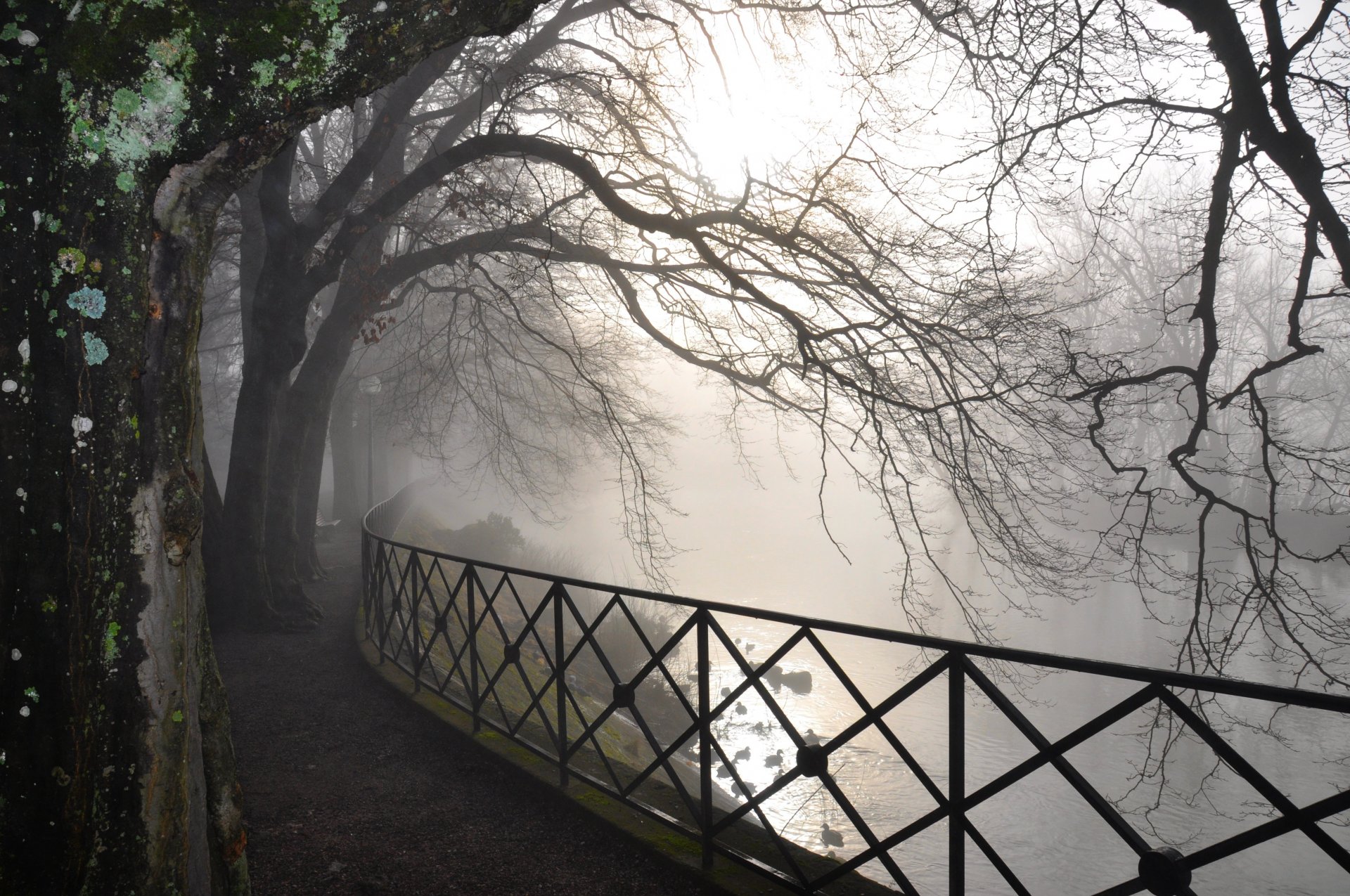 Winter trees growing along the river in an open space