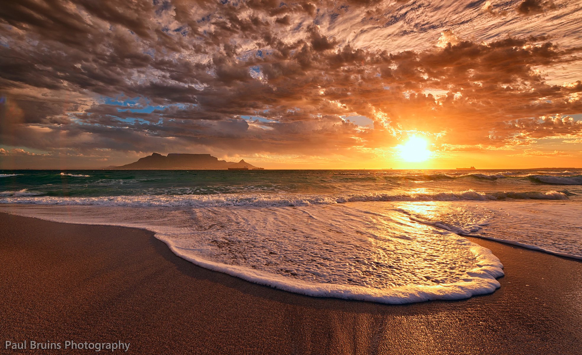 Under a gray sky, the sea surf rolls on the rocks