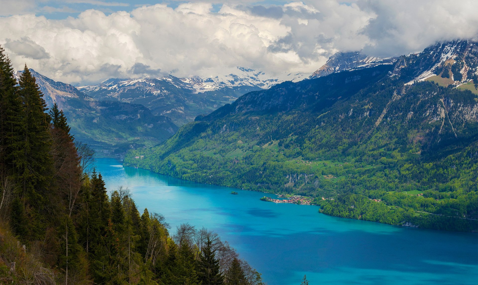 Blue river along the mountains and forests