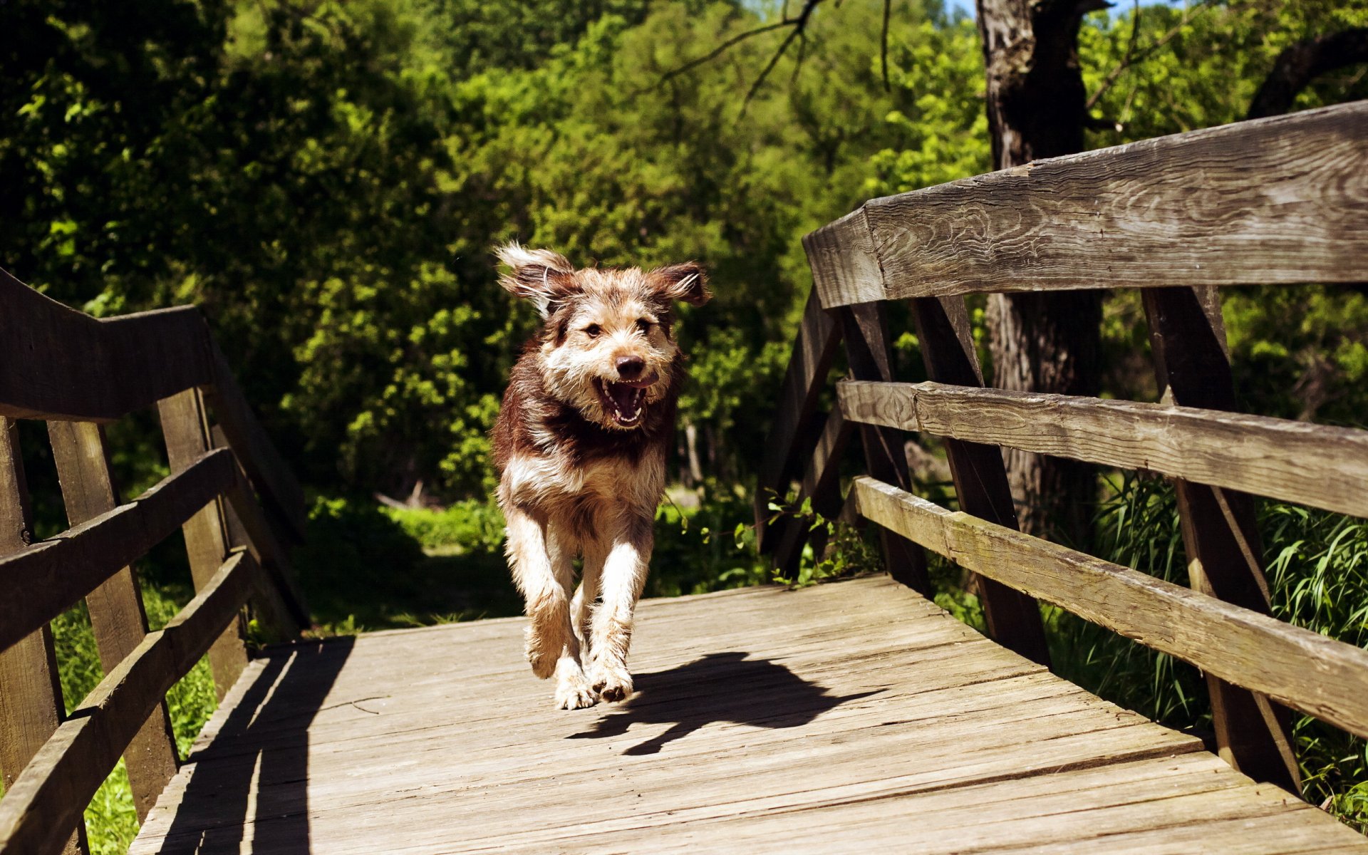 A shaggy cute dog runs across the bridge