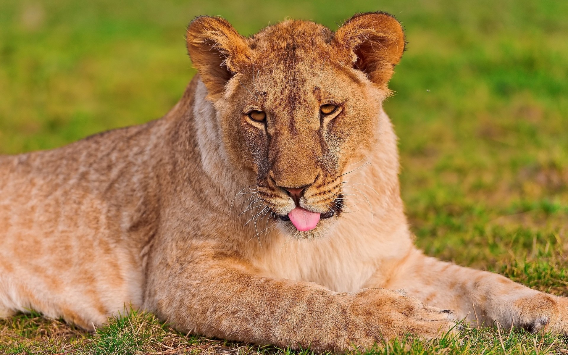 A contented lioness lying on the grass