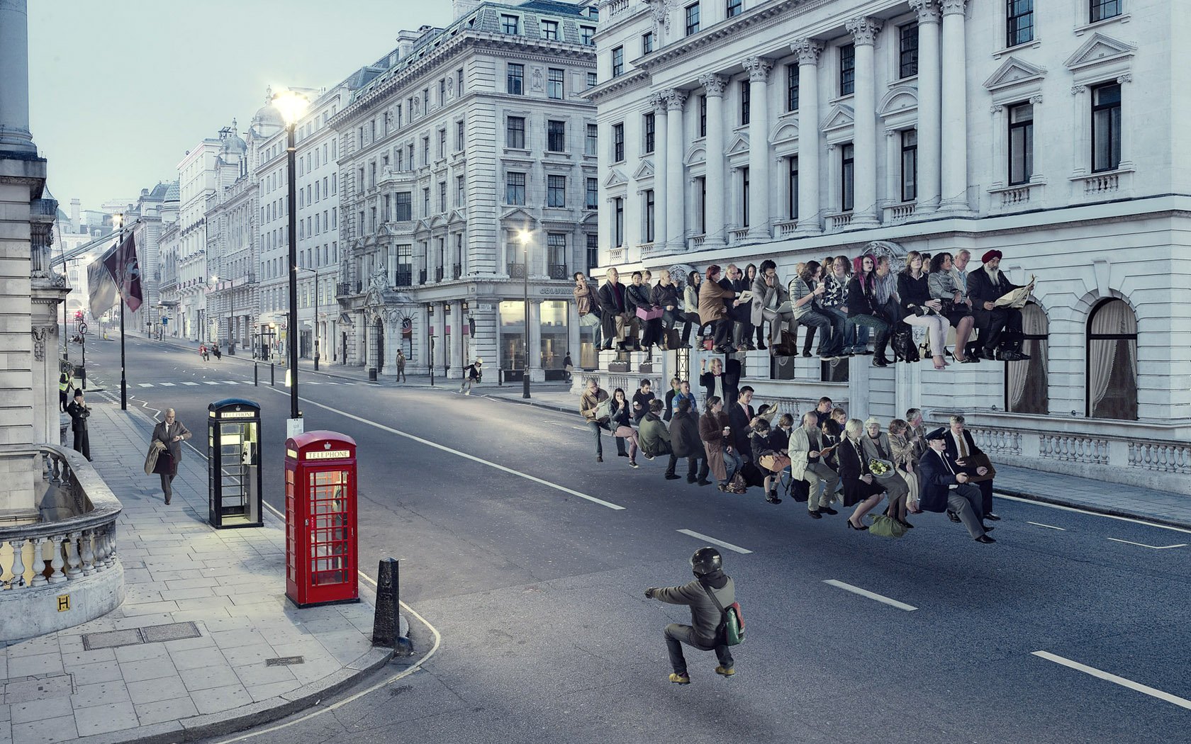 Photo of a stranger in red on the background of a busPhoto of a stranger in red on the background of a bus