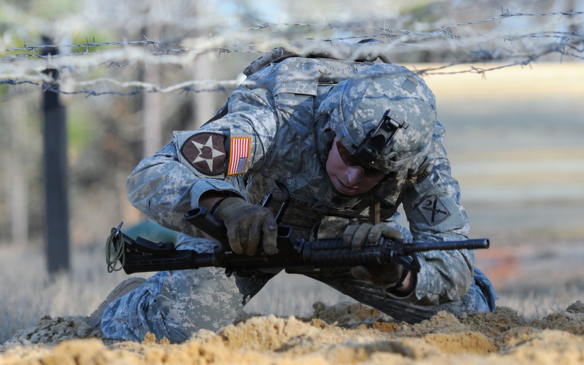 A soldier with a gun climbs through an obstacle courseA soldier with a gun climbs through an obstacle course