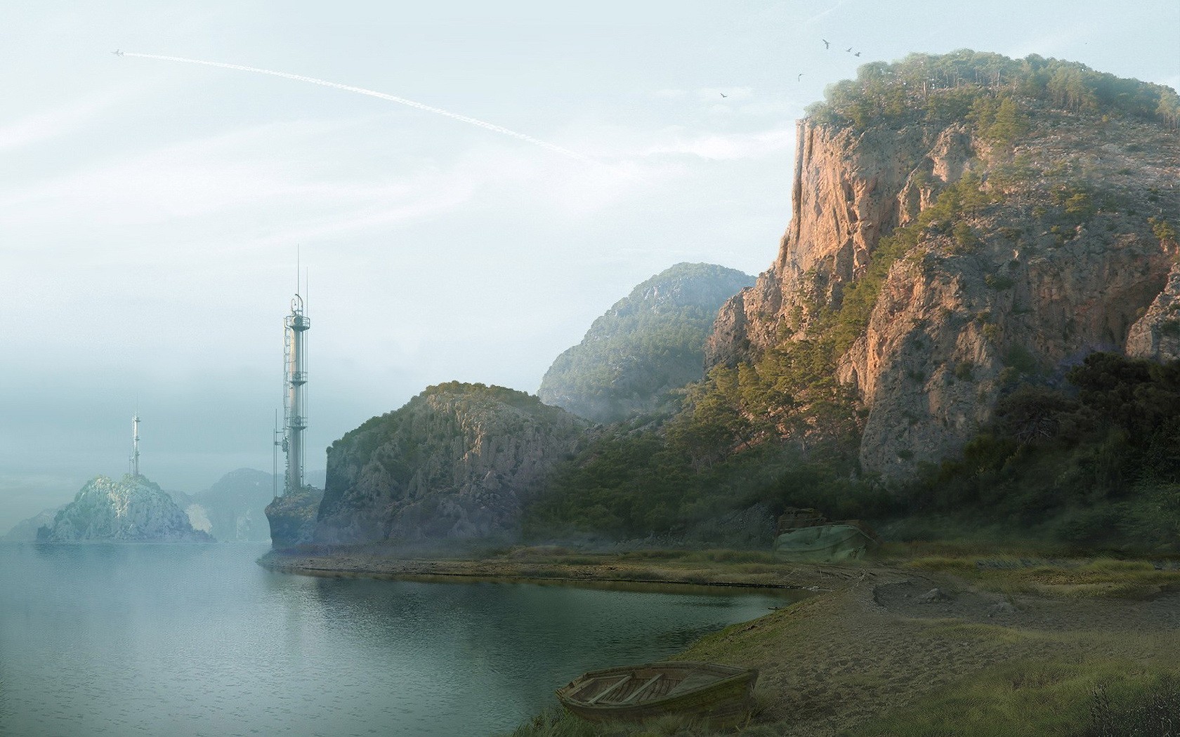 Shore, dock, mountain and antennas