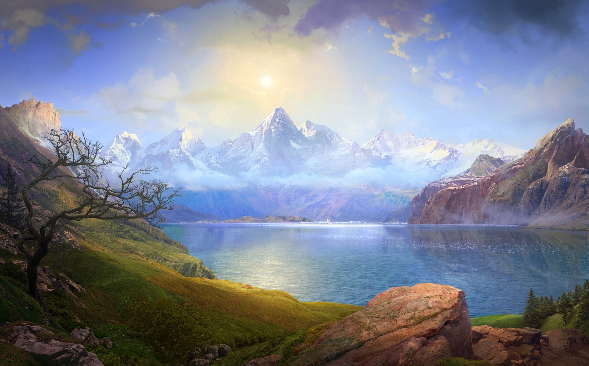 Rocky hills rise above a red field in the sunset rays of a solar starRocky hills rise above a red field in the sunset rays of a solar star