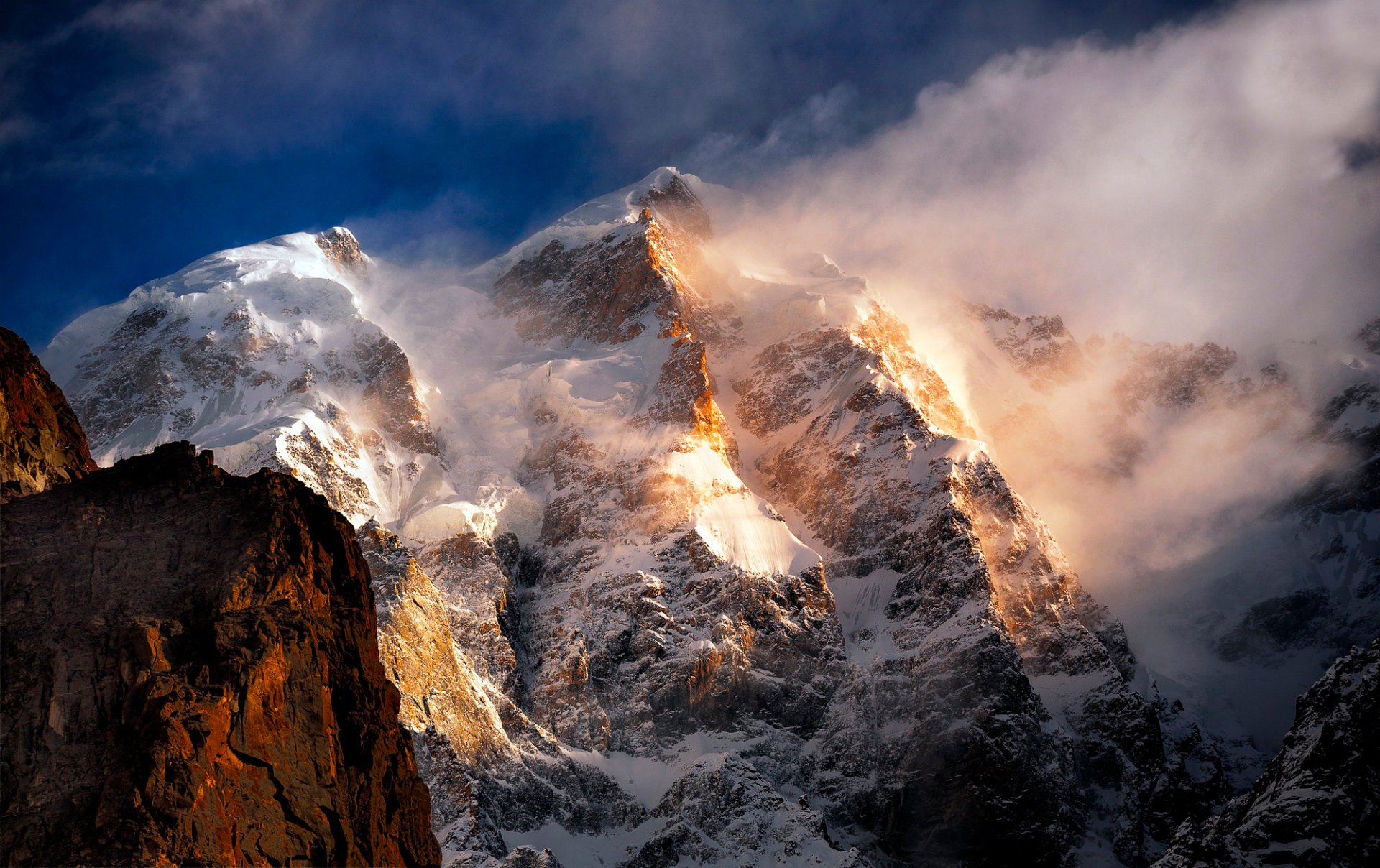 A roaring polar bear sitting on a rocky seashore against a stormy sky
