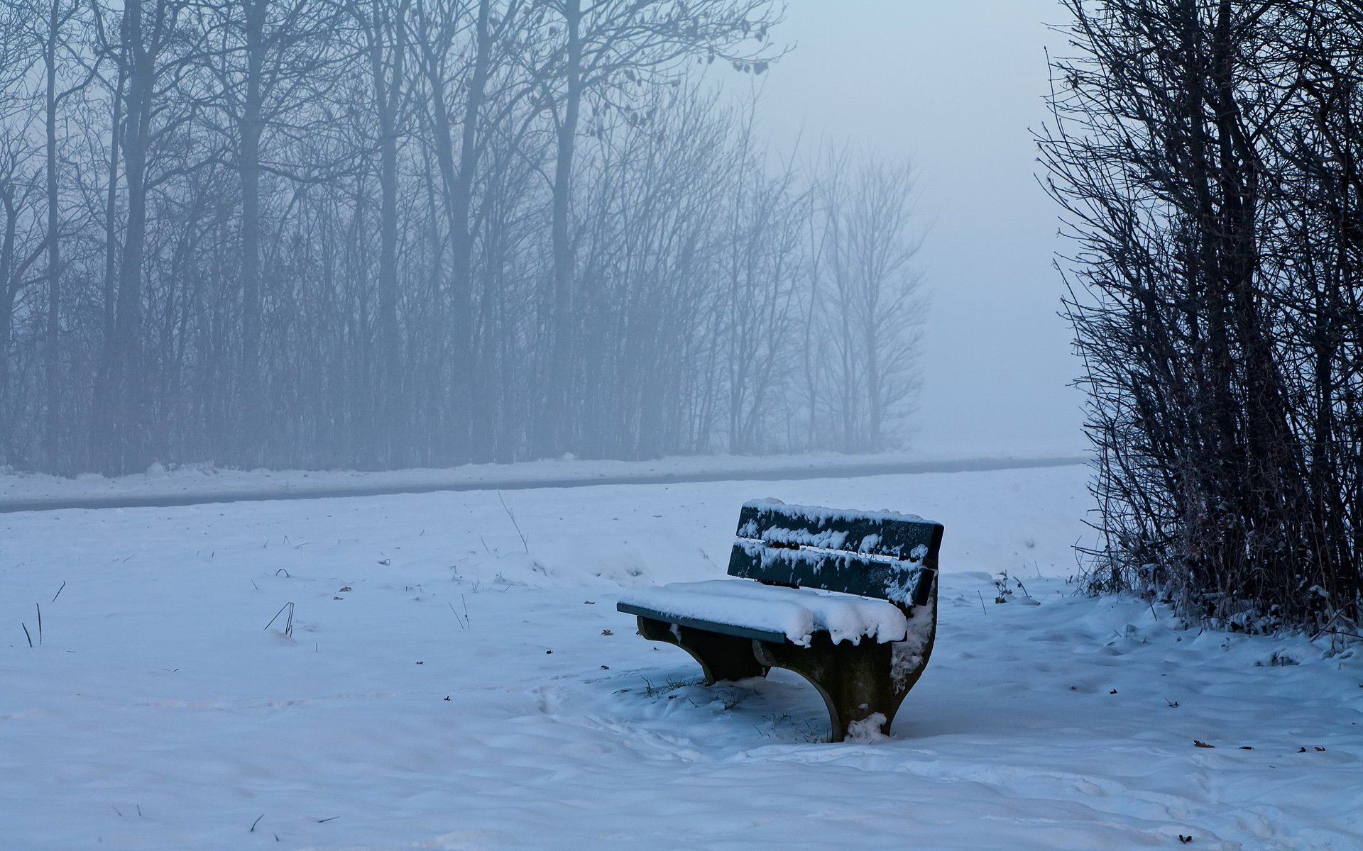 A snow-covered bench against the background of a winter landscapeA snow-covered bench against the background of a winter landscape